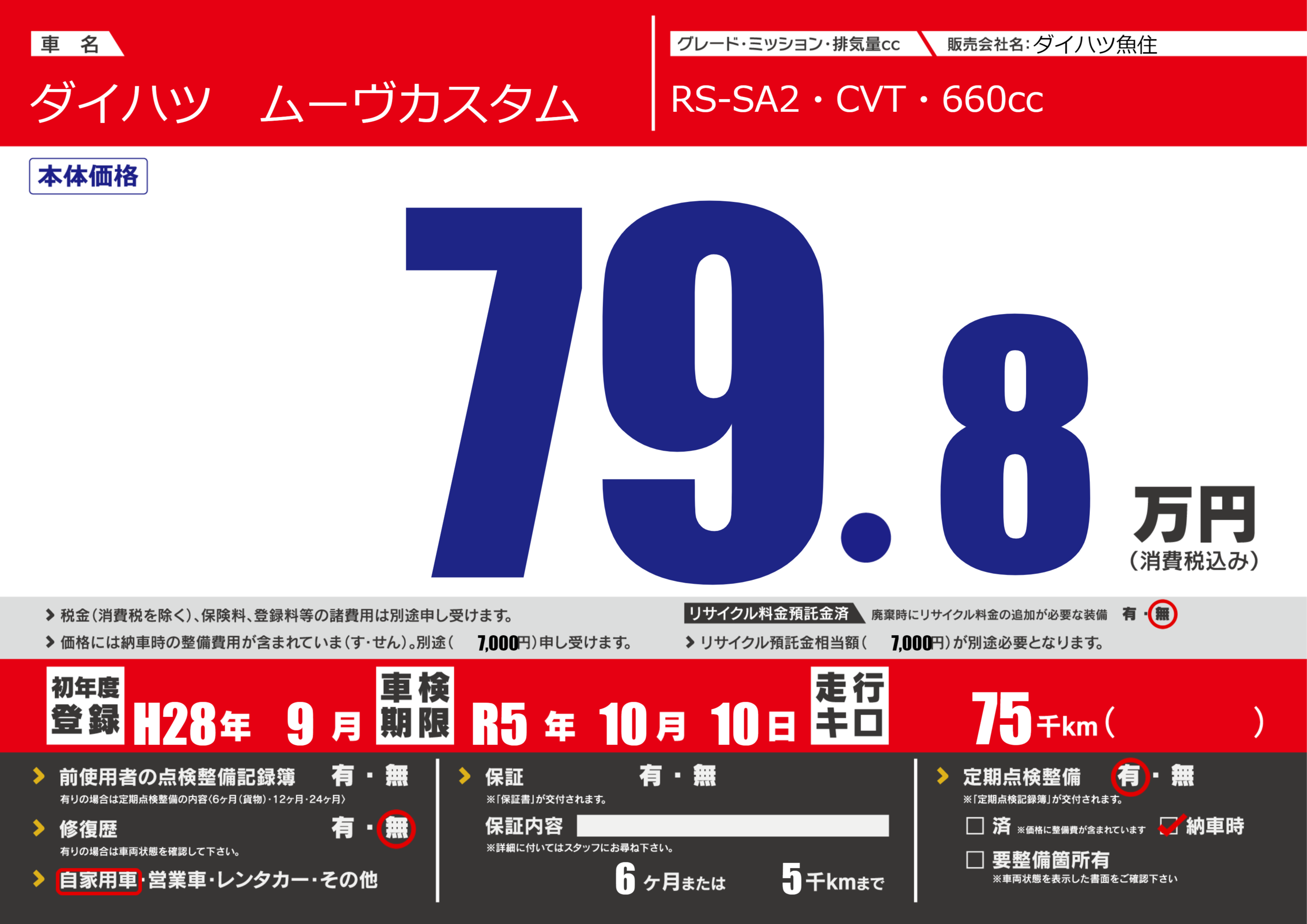 | 走行キロ | 7.5万km | 初年度登録 | H28年9月 |