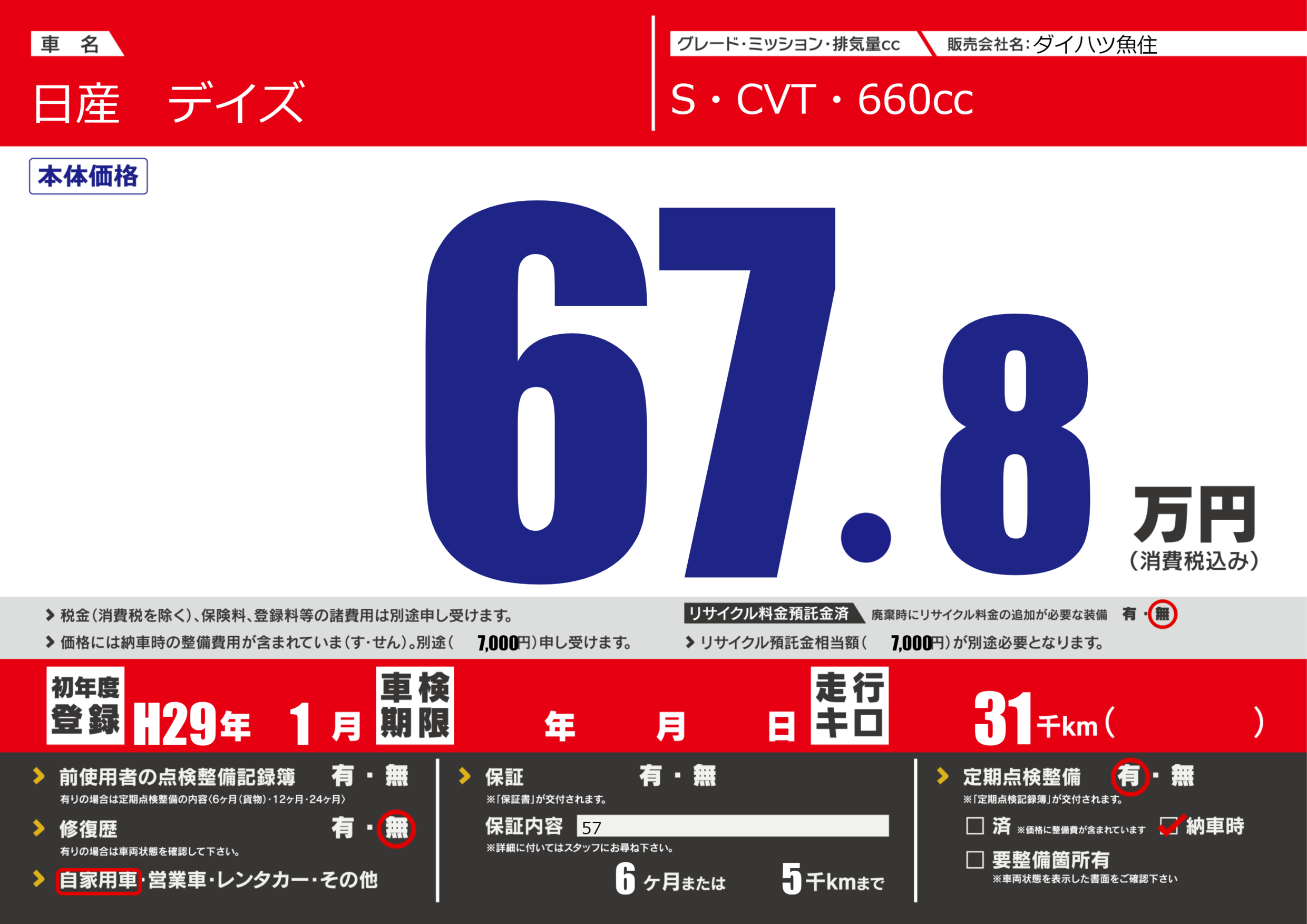 保証なし 保証内容(57) 6ヶ月または(5)千kmまで |