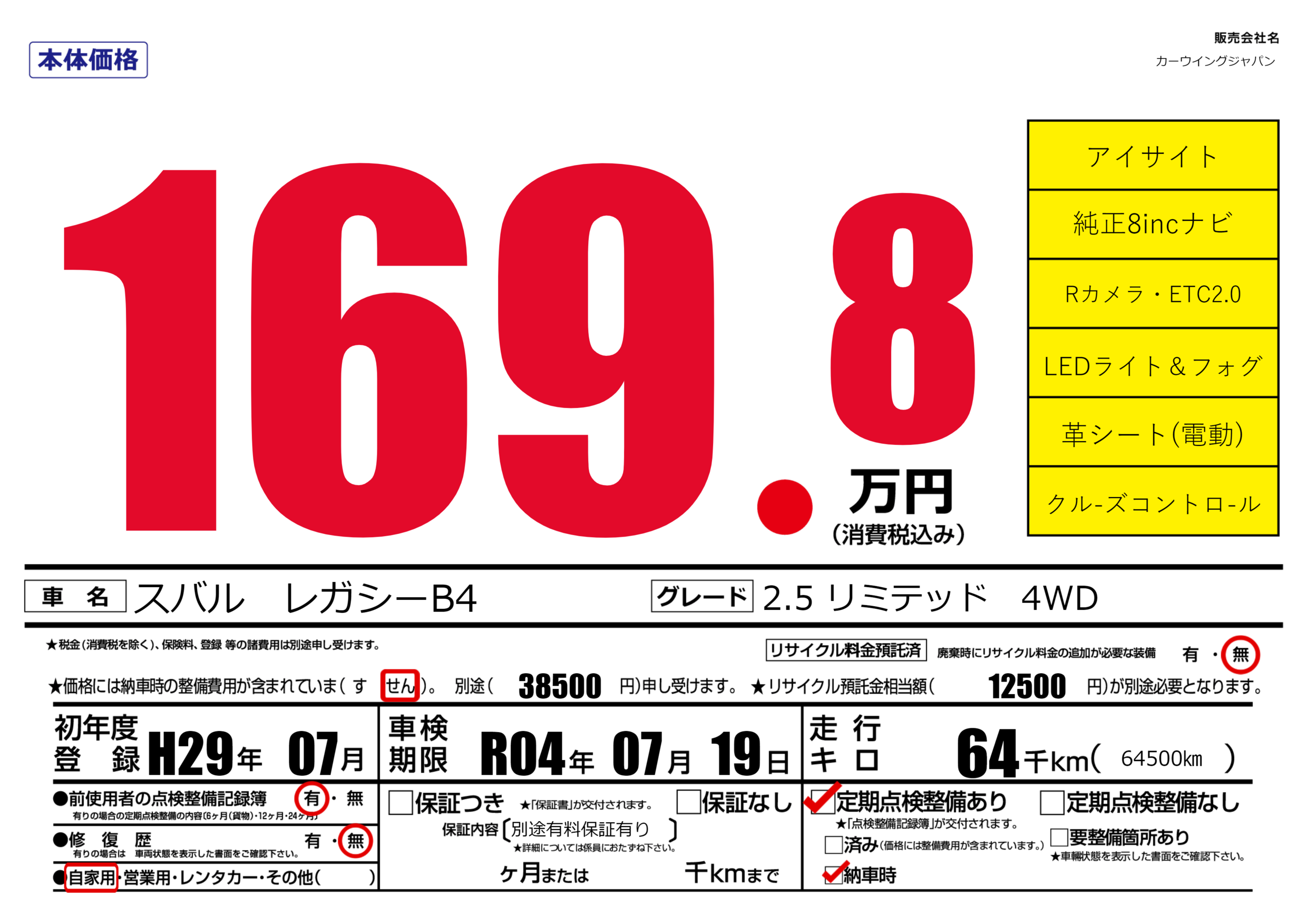 | 車名 | スバル レガシーB4 | グレード ミッション 排気量 |