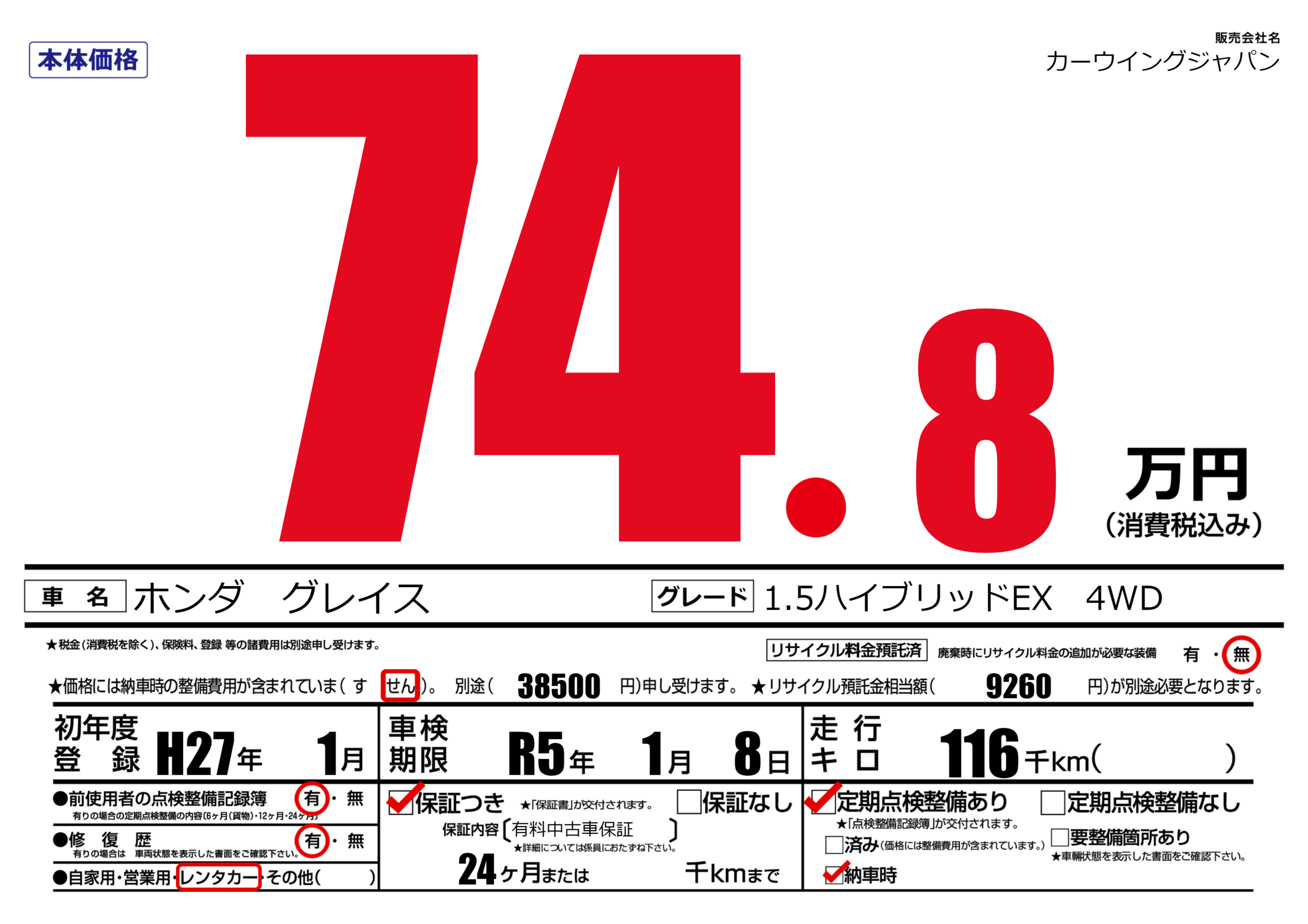 | 車名 | ホンダ グレイス | グレード ミッション 排気量 |
