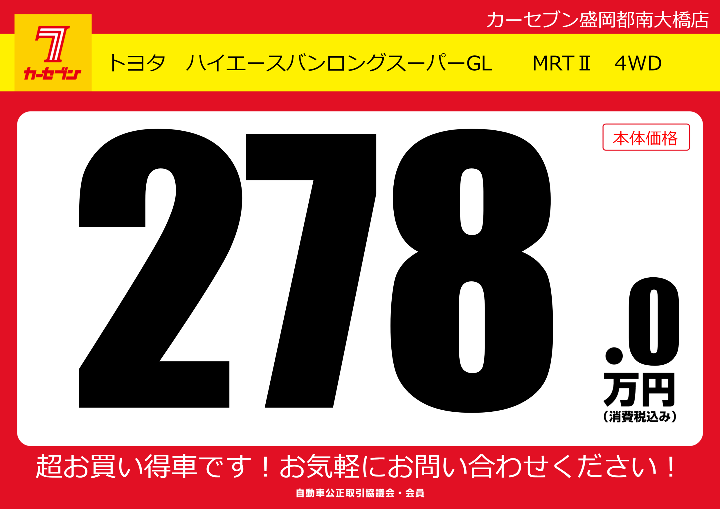 | 車名 | トヨタ ハイエースバンロングスーパーGL MRTⅡ 4WD | グレード ミッション 排気量 |