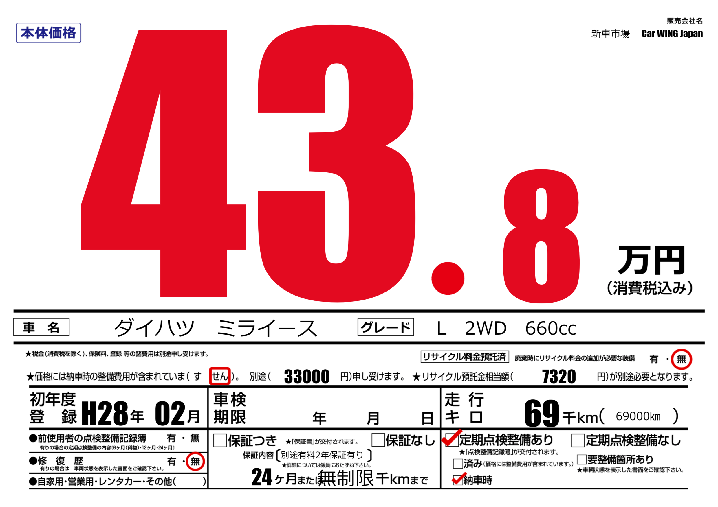| 定期点検整備 | 定期点検整備あり 納車時あり | ||