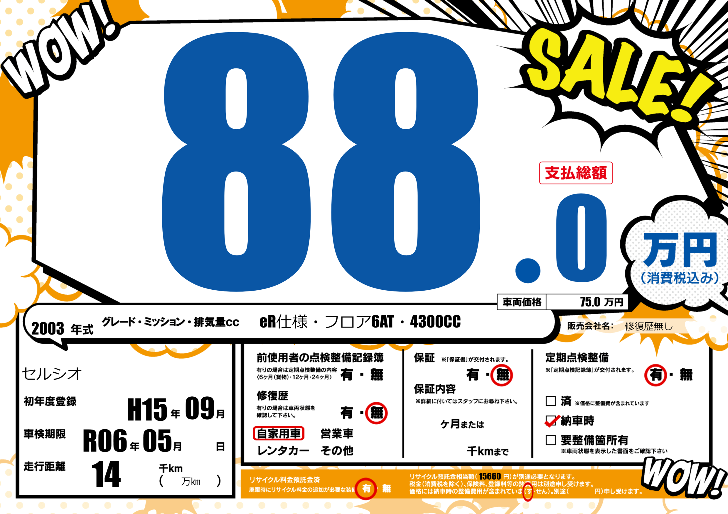 | 走行キロ | 1.4万km | 初年度登録 | H15年09月 |