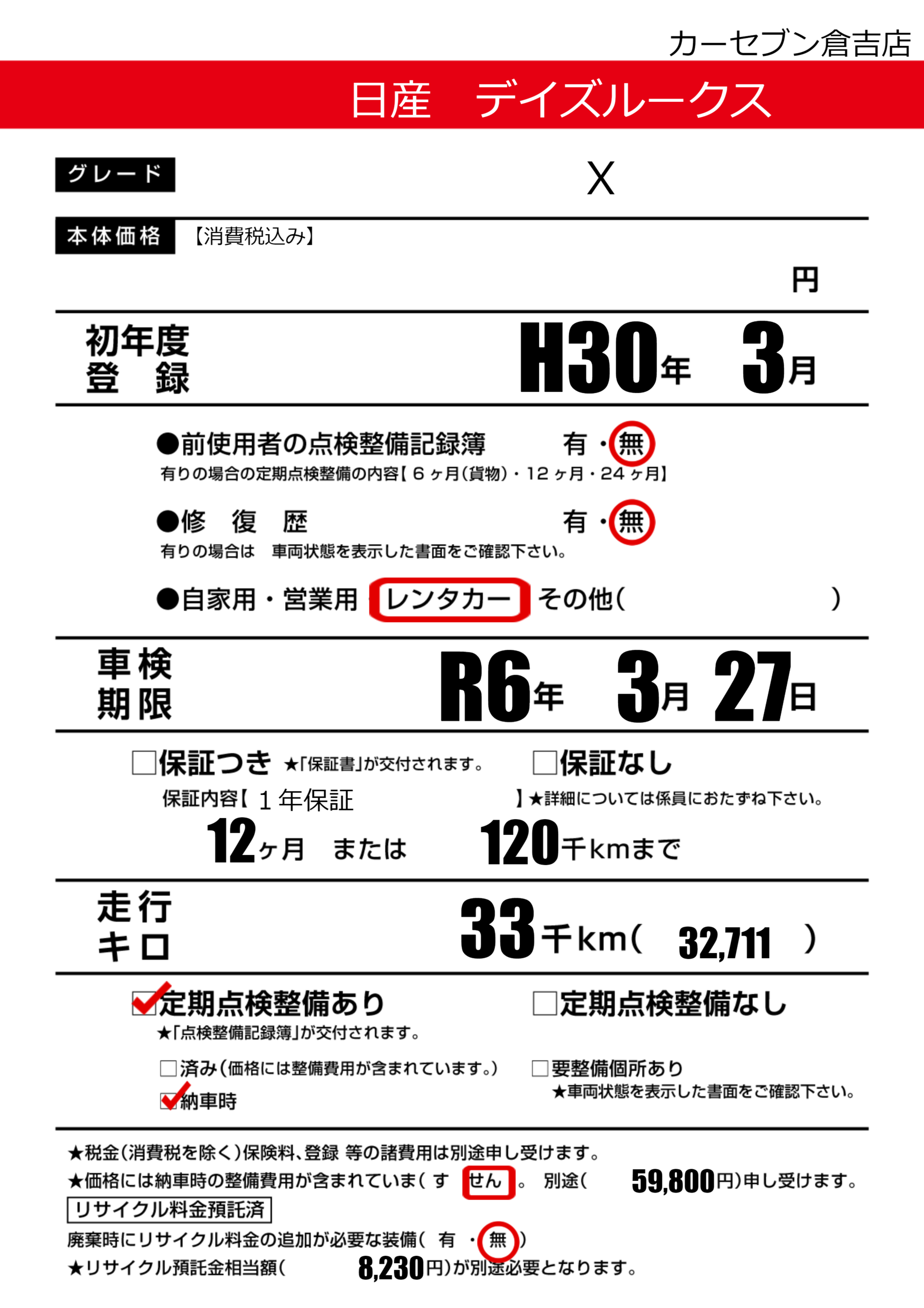 | 車名 | 日産 デイズルークス | グレード ミッション 排気量 |