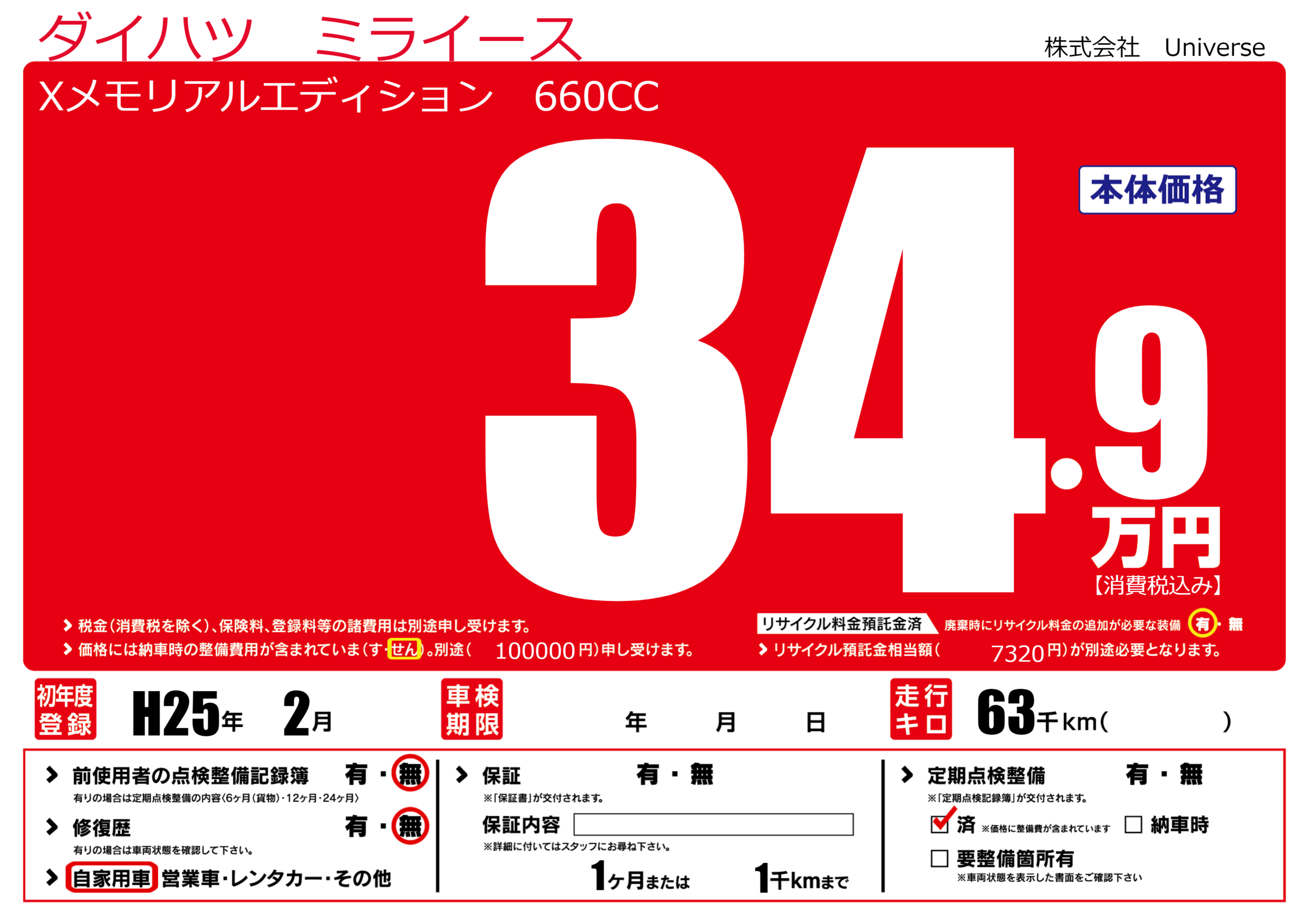 | 走行キロ | 6.3万km | 初年度登録 | H25年2月 |