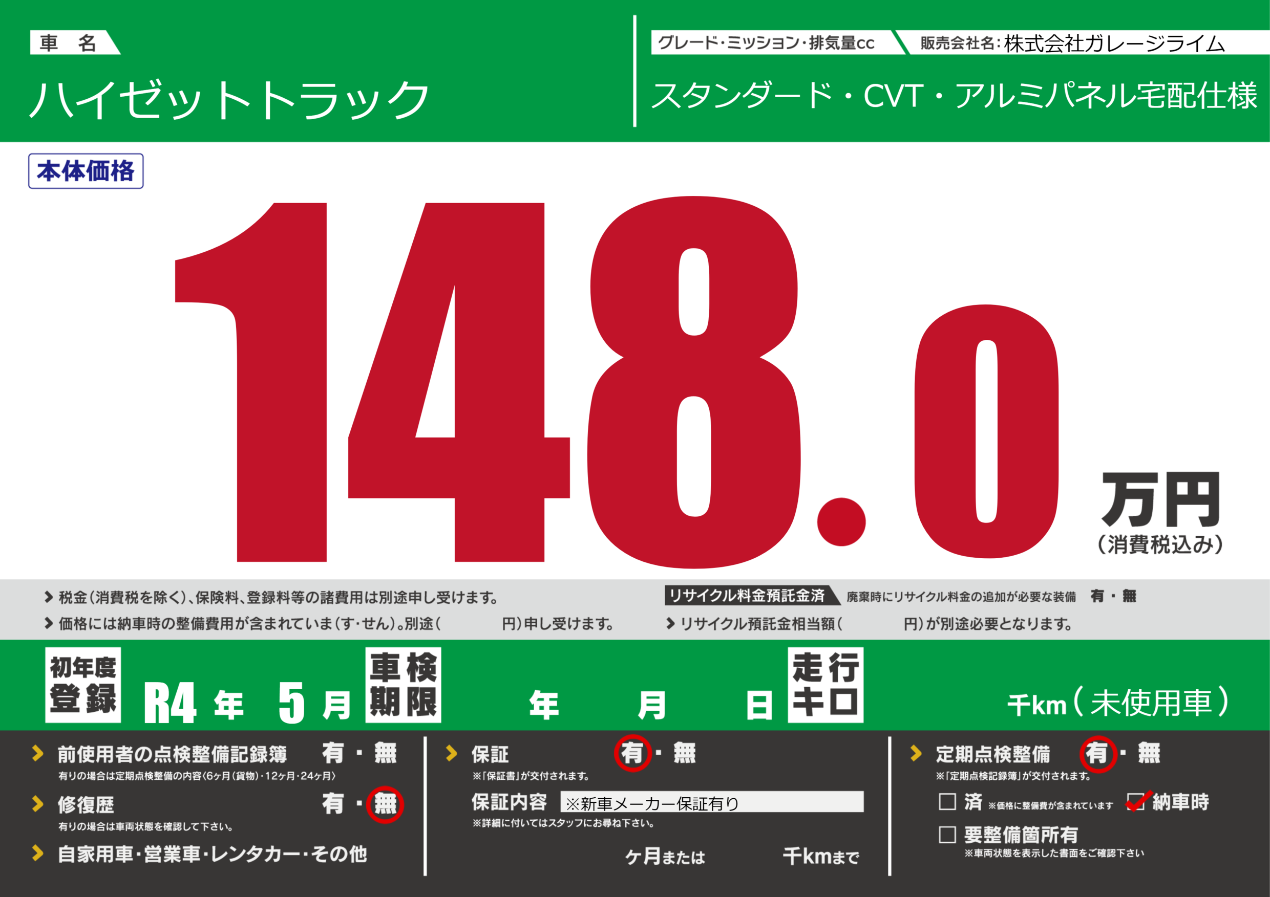 | 車名 | ハイゼットトラック | グレード ミッション 排気量 |