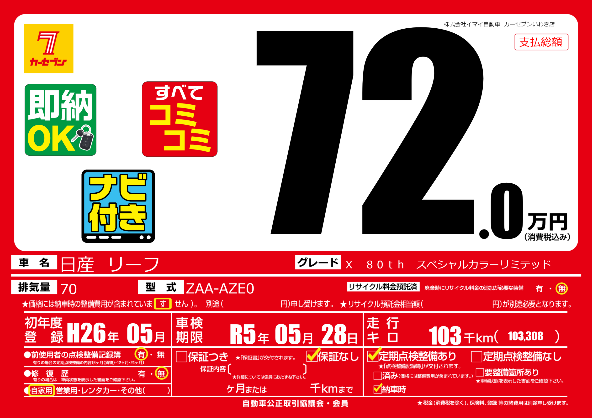 あり | 車検制限 | R5年05月28月 |