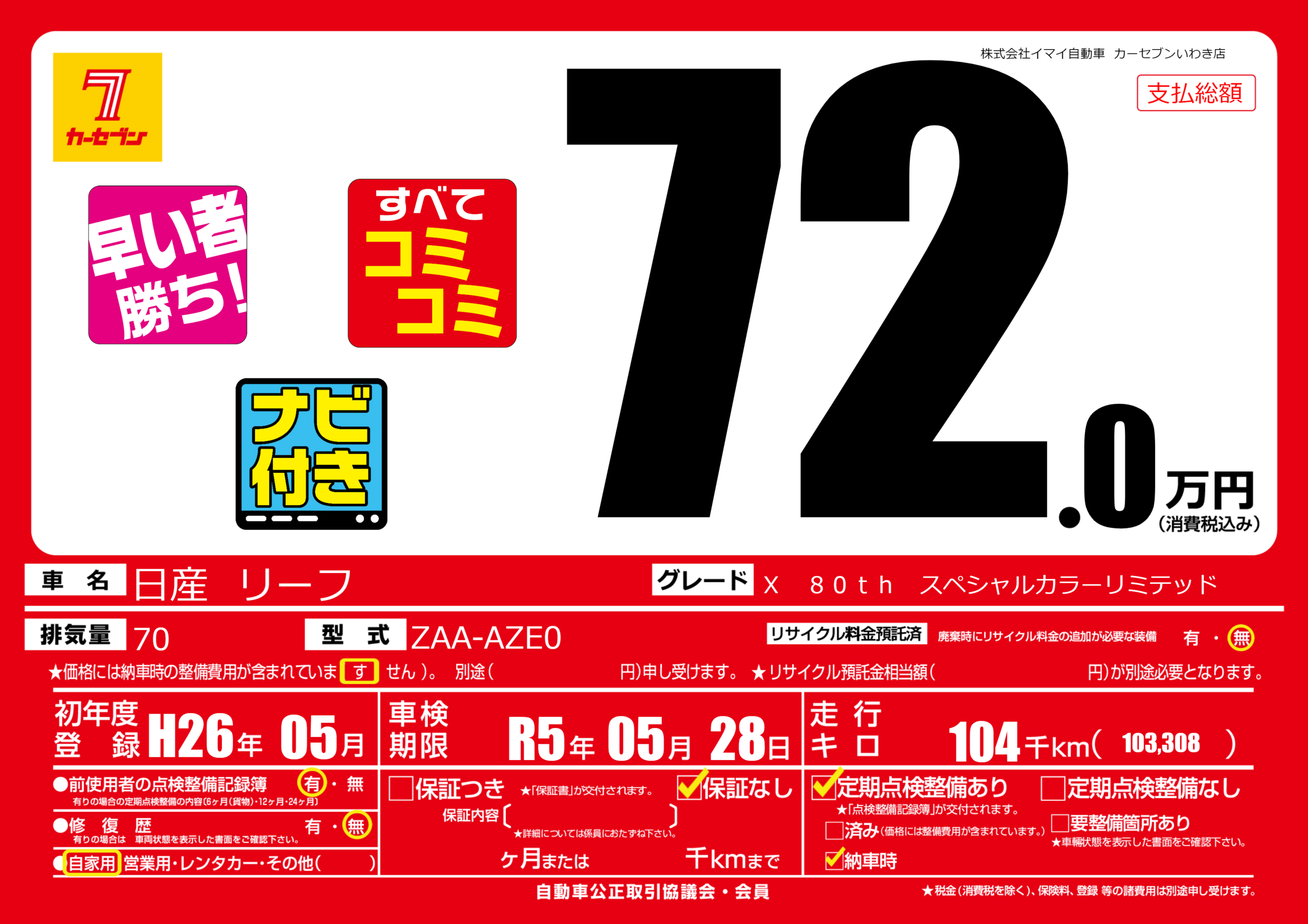 | 車名 | 日産 リーフ | グレード ミッション 排気量 |