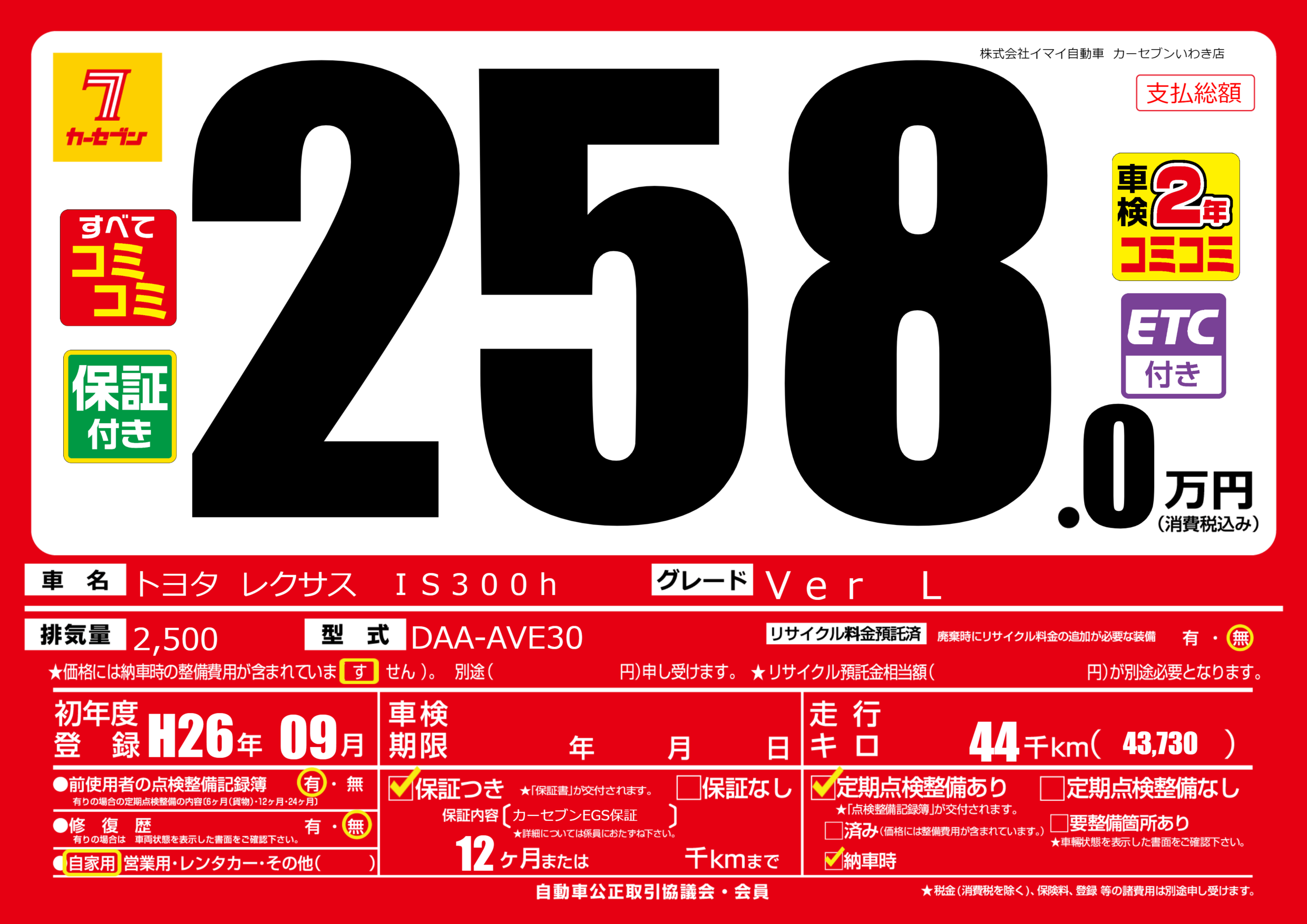 | 車名 | トヨタ レクサス IS300h | グレード ミッション 排気量 |