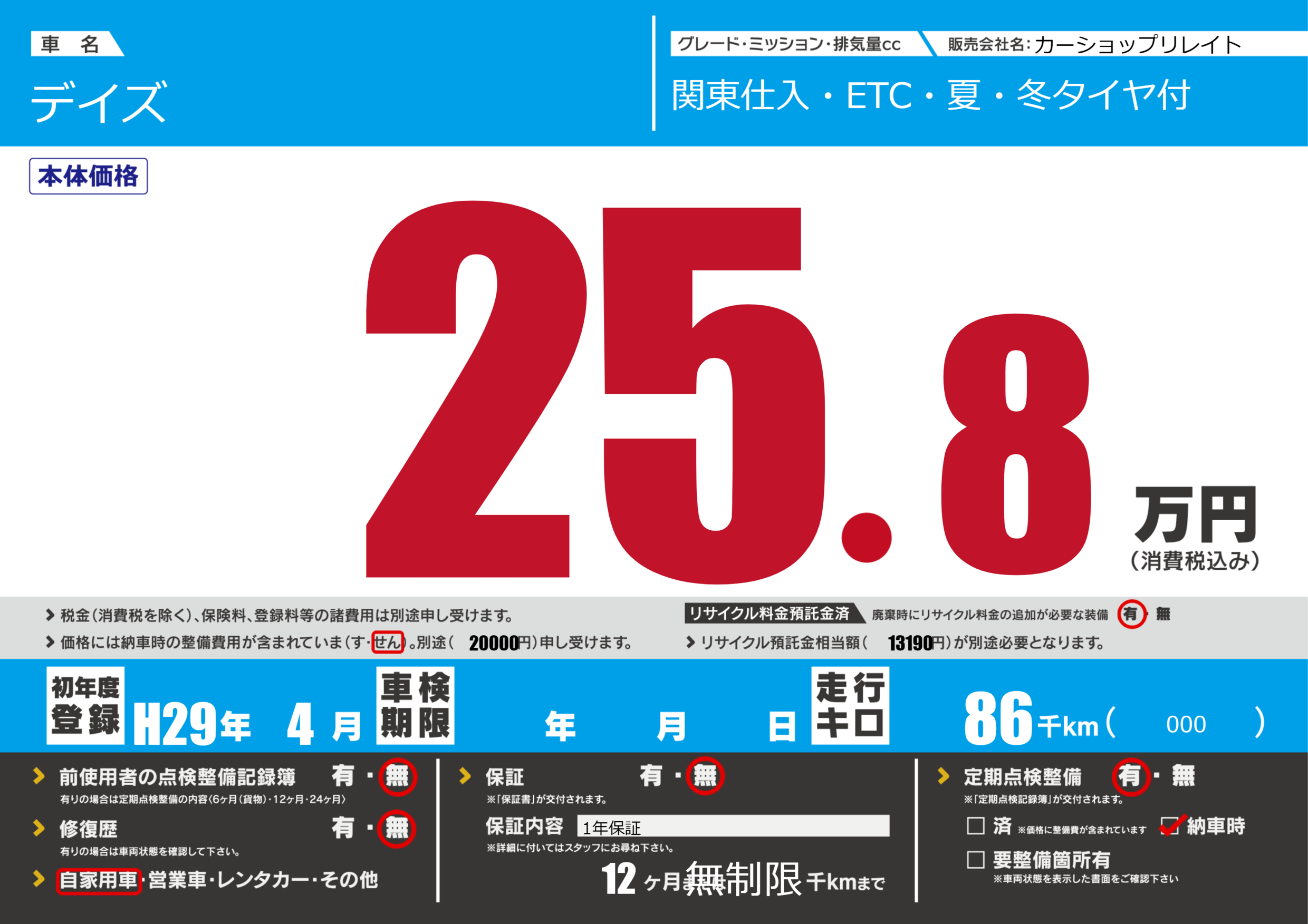 | 車名 | デイズ | グレード ミッション 排気量 |
