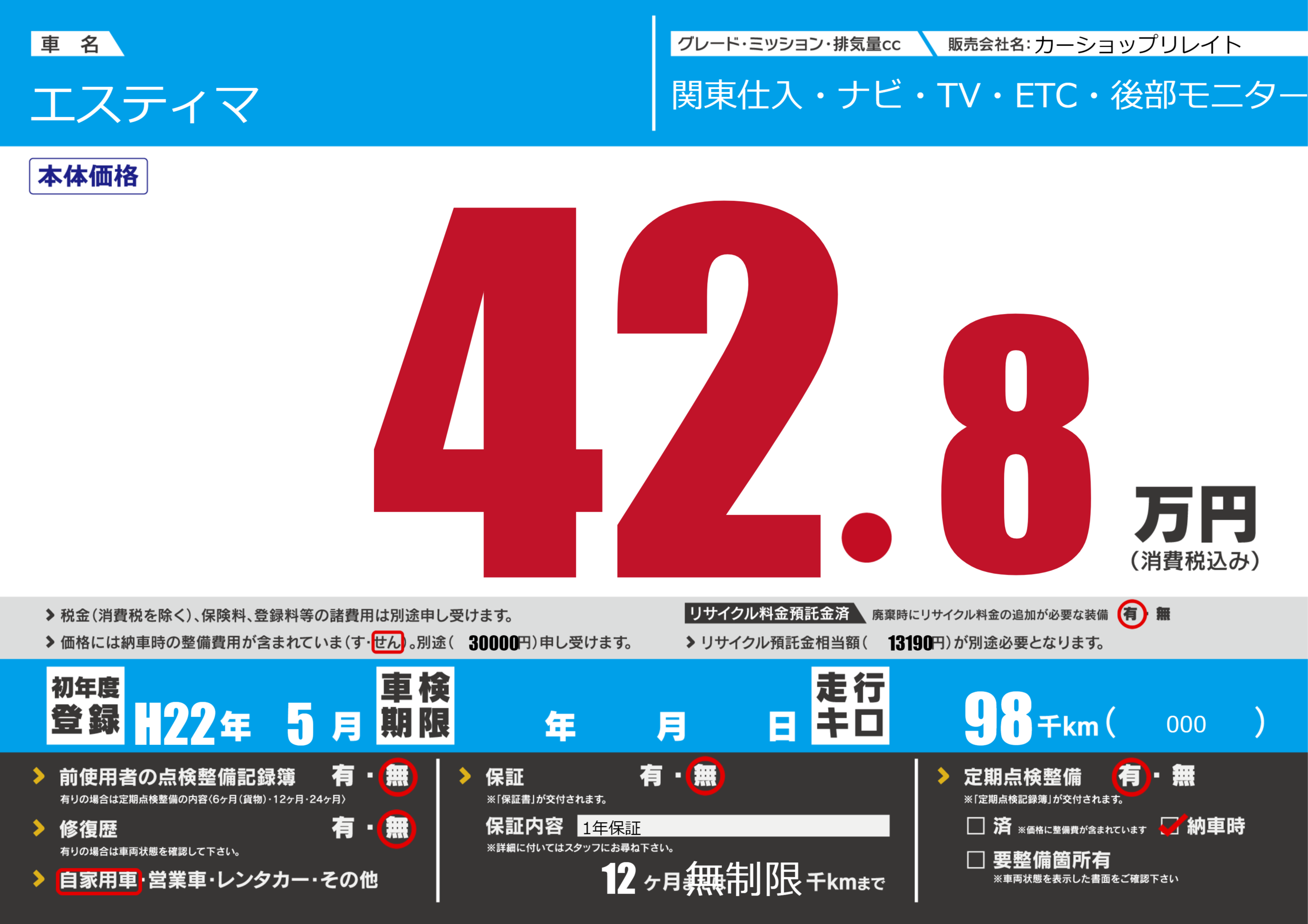 | 車名 | エスティマ | グレード ミッション 排気量 |
