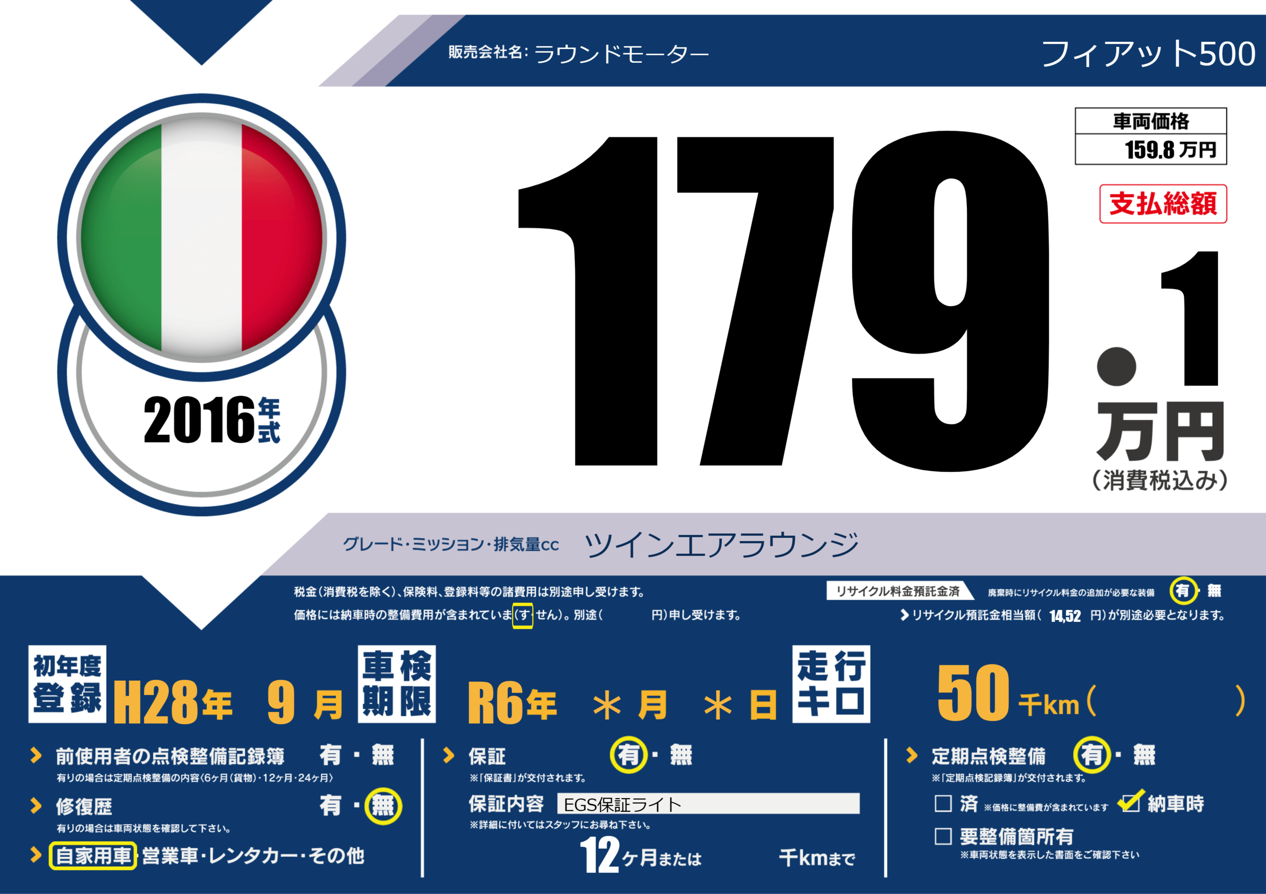 | 車名 | フィアット500 | グレード ミッション 排気量 |