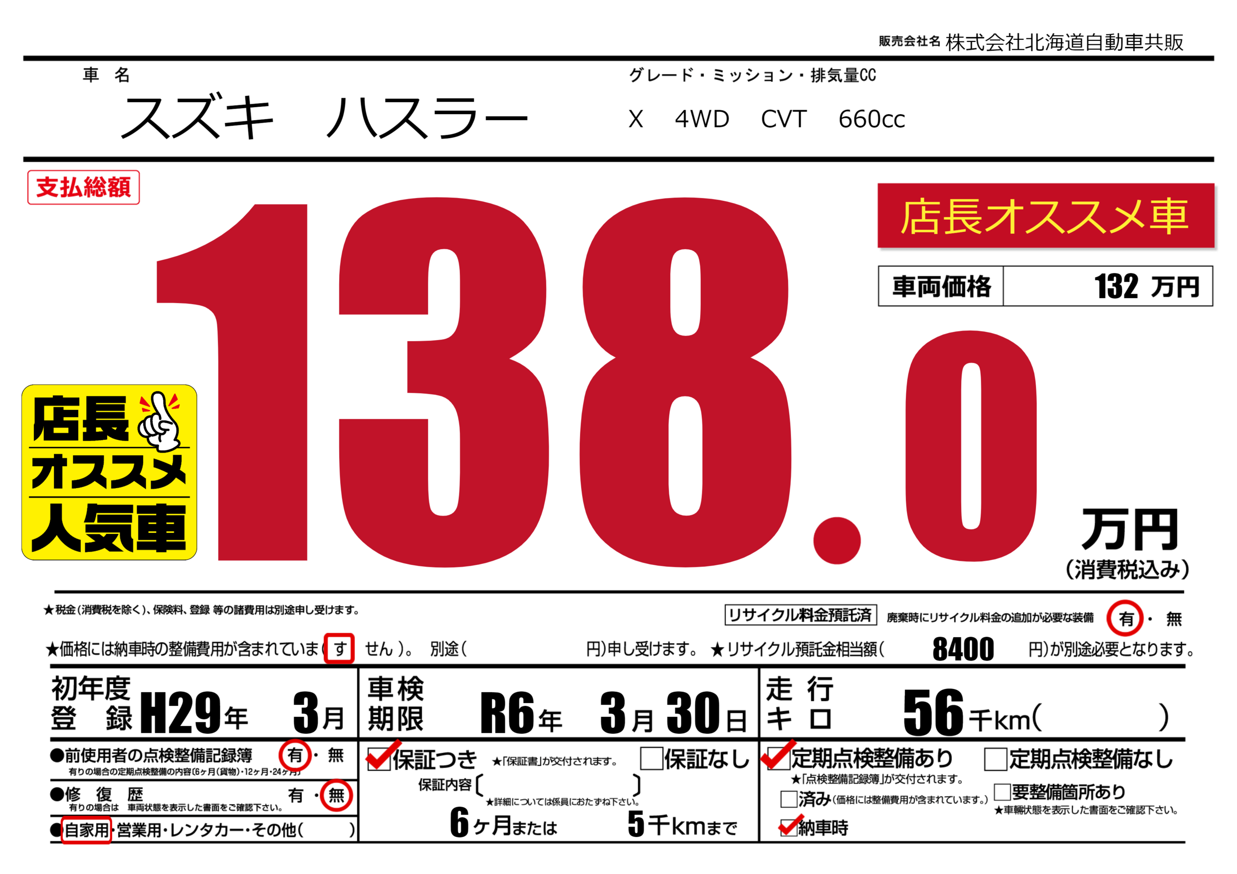 | 車名 | スズキ ハスラー | グレード ミッション 排気量 |