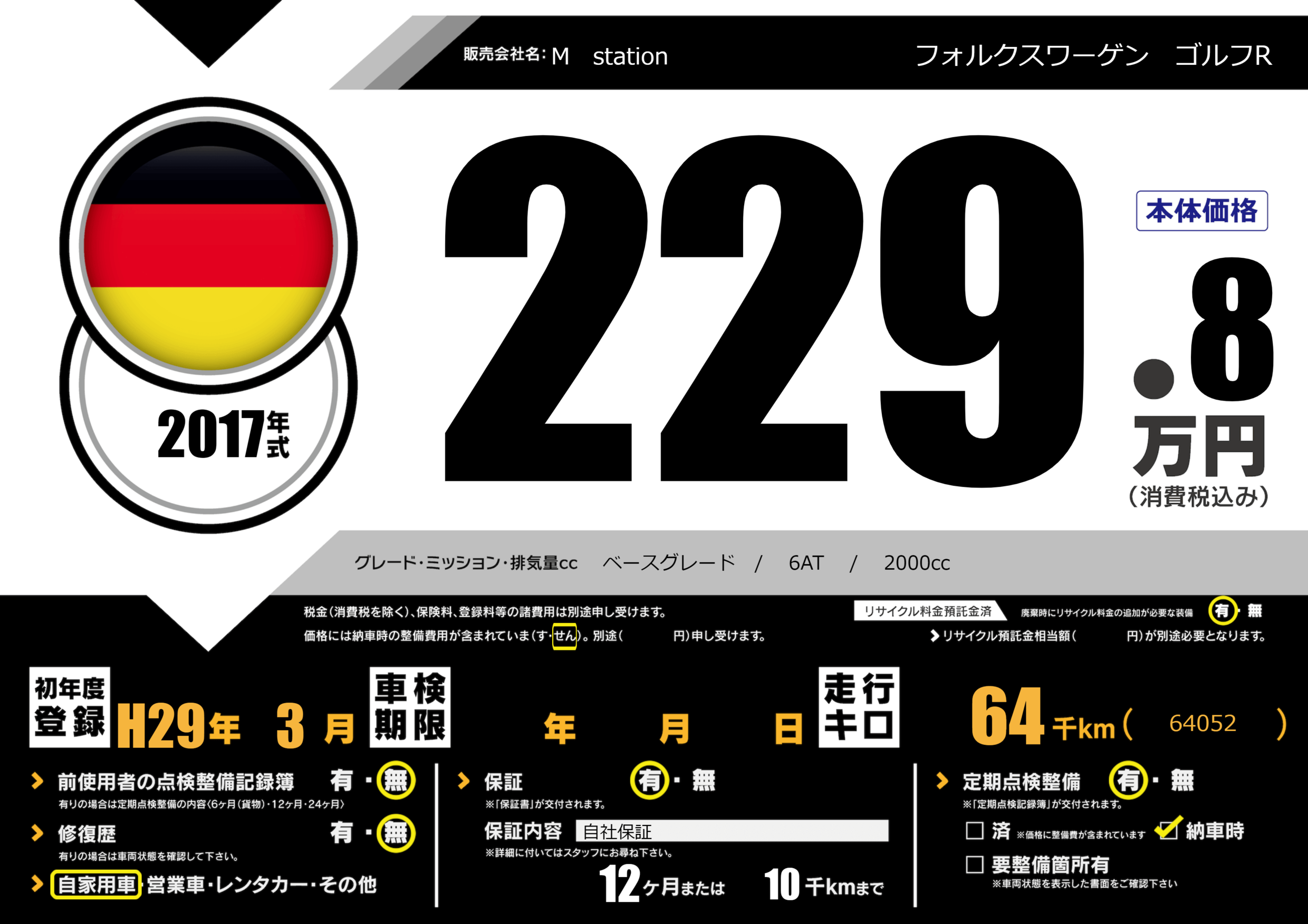| 車名 | フォルクスワーゲン ゴルフR | グレード ミッション 排気量 |