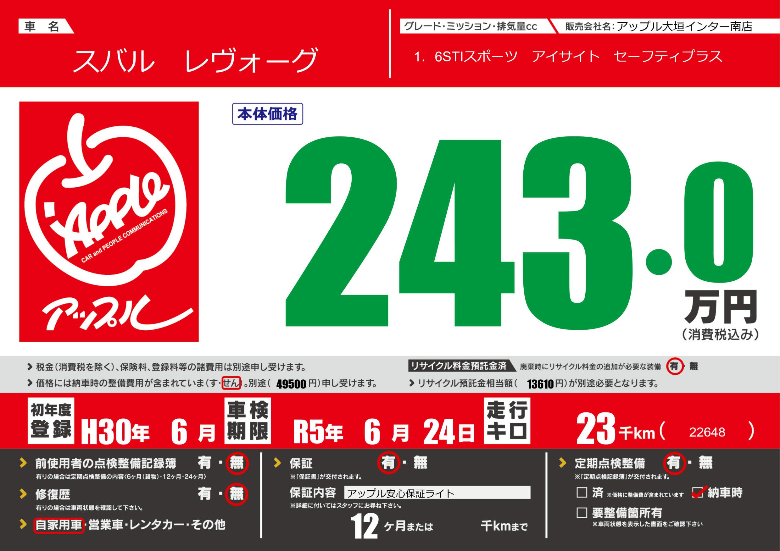 保証付き 保証内容(アップル安心保証ライト) 12ヶ月または()千kmまで |