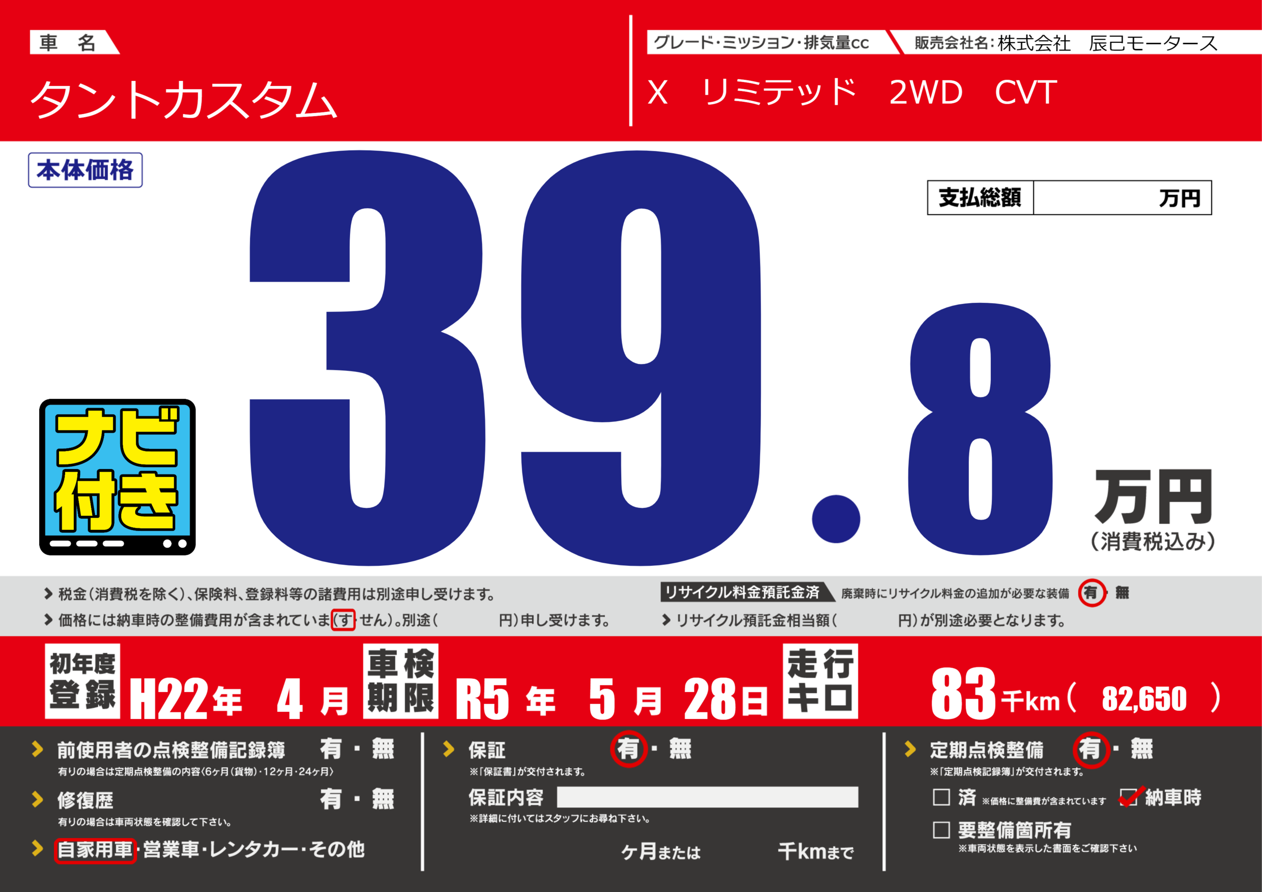 | 走行キロ | 8.3万km | 初年度登録 | H22年4月 |
