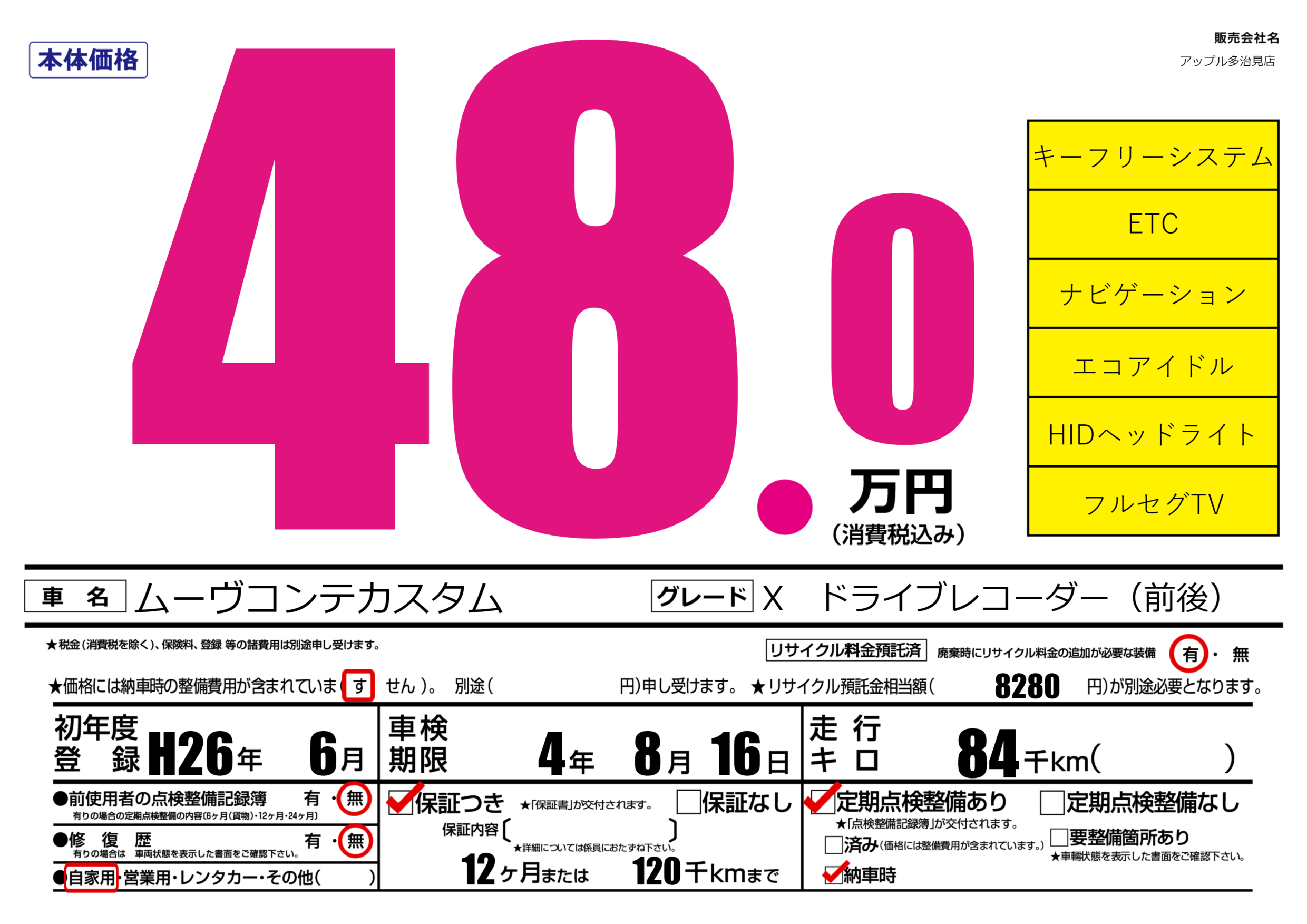 | 車名 | ムーヴコンテカスタム | グレード ミッション 排気量 |