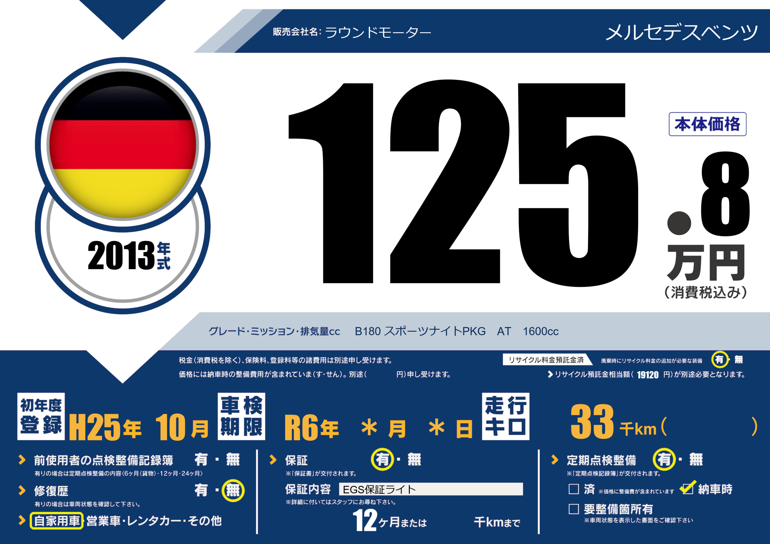 | 車名 | メルセデスベンツ | グレード ミッション 排気量 |
