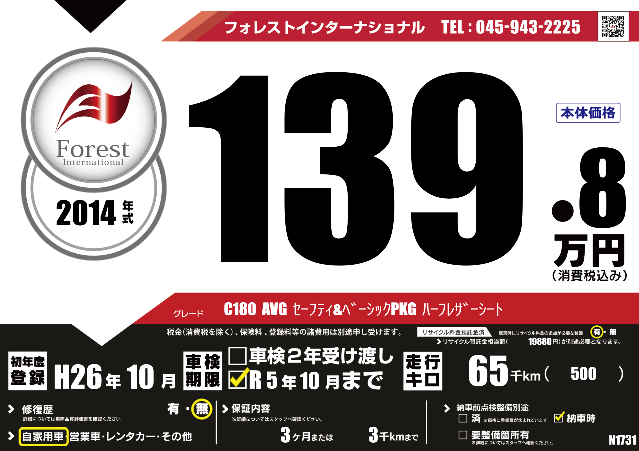 | 走行キロ | 6.5万km | 初年度登録 | H26年10月 |