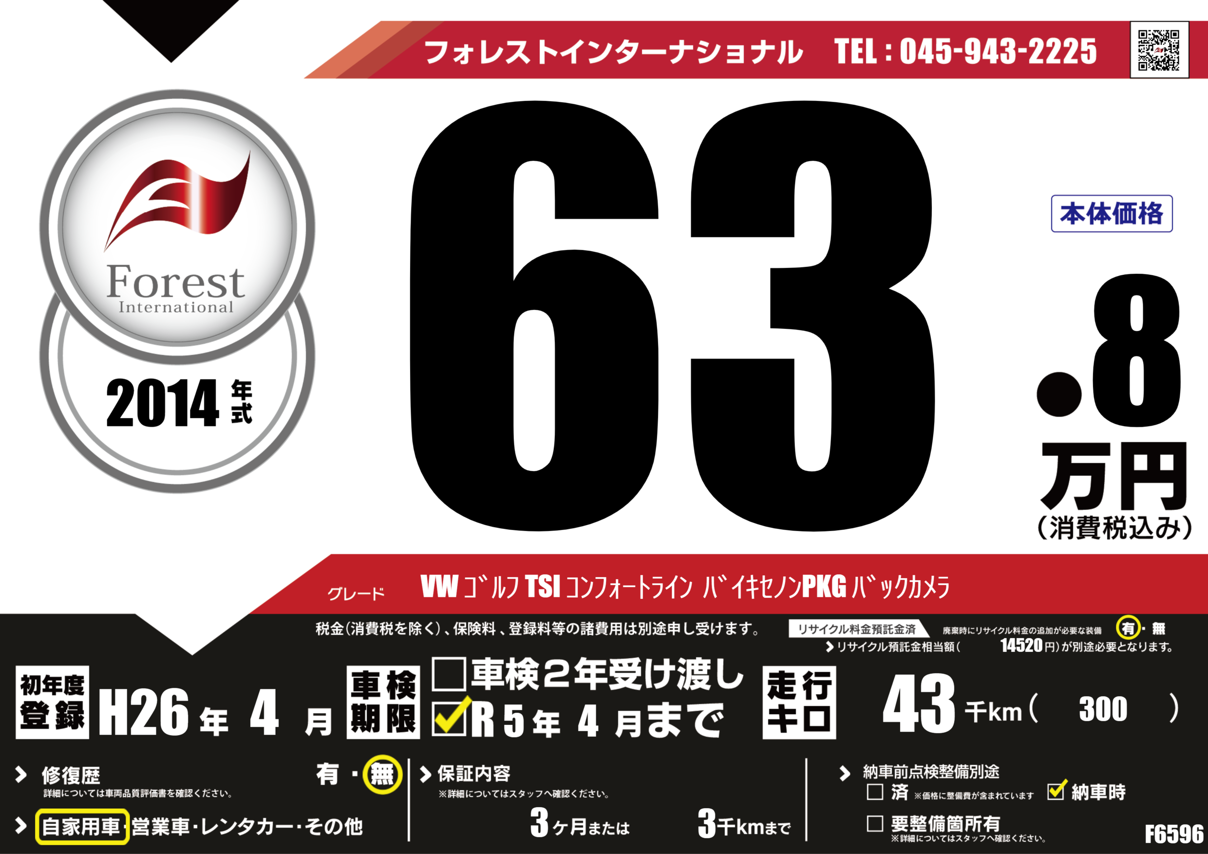 | 走行キロ | 4.3万km | 初年度登録 | H26年4月 |