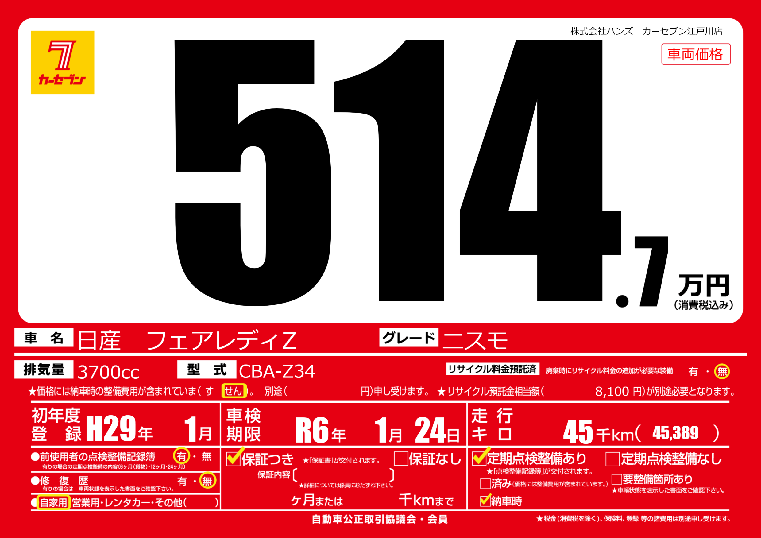 | 車名 | 日産 フェアレディZ | グレード ミッション 排気量 |