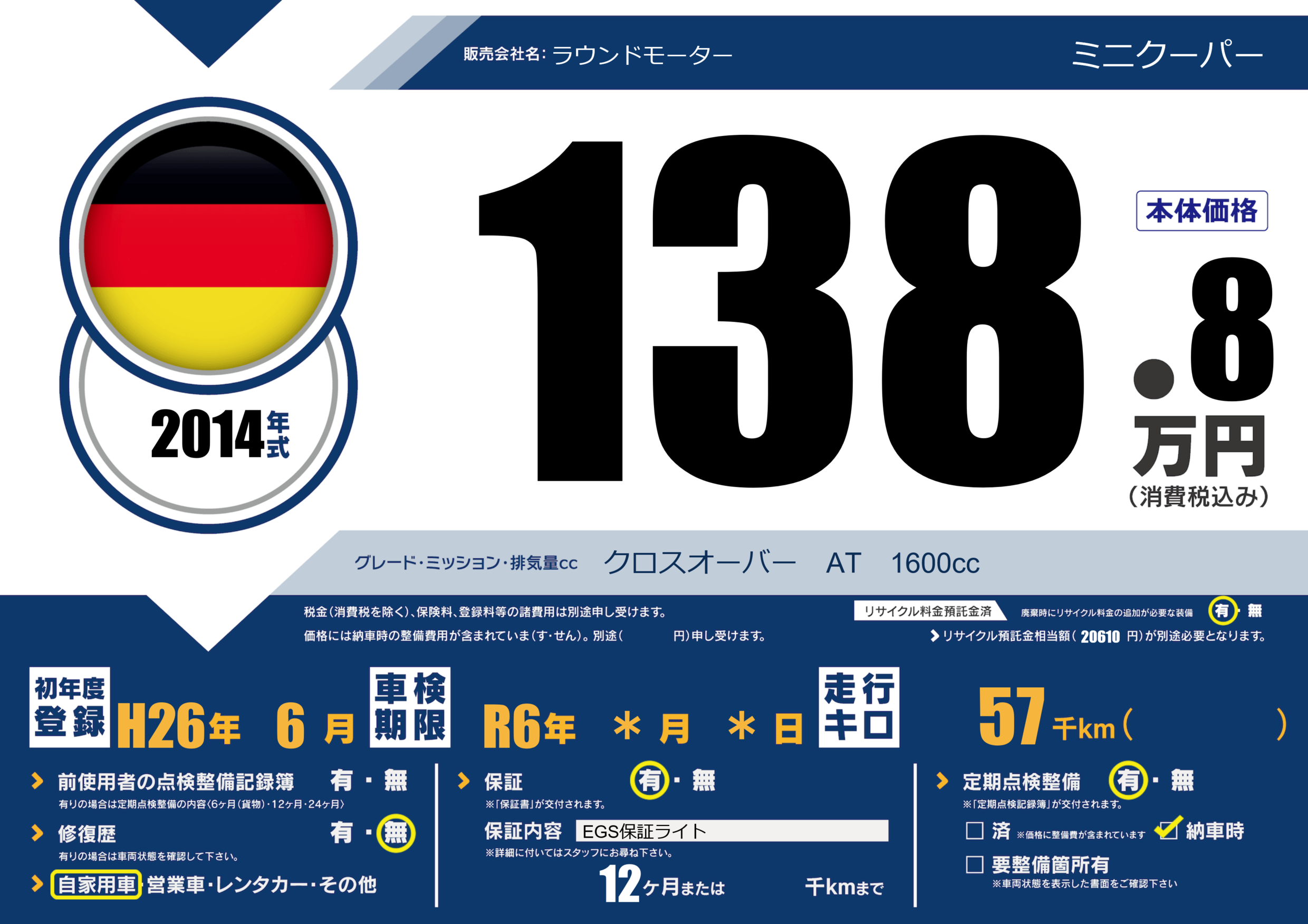 | 車名 | ミニクーパー | グレード ミッション 排気量 |