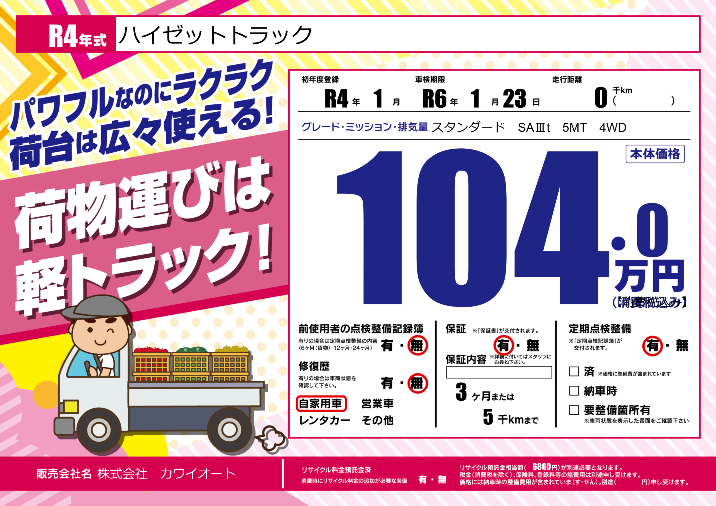 | 車名 | ハイゼットトラック | グレード ミッション 排気量 |