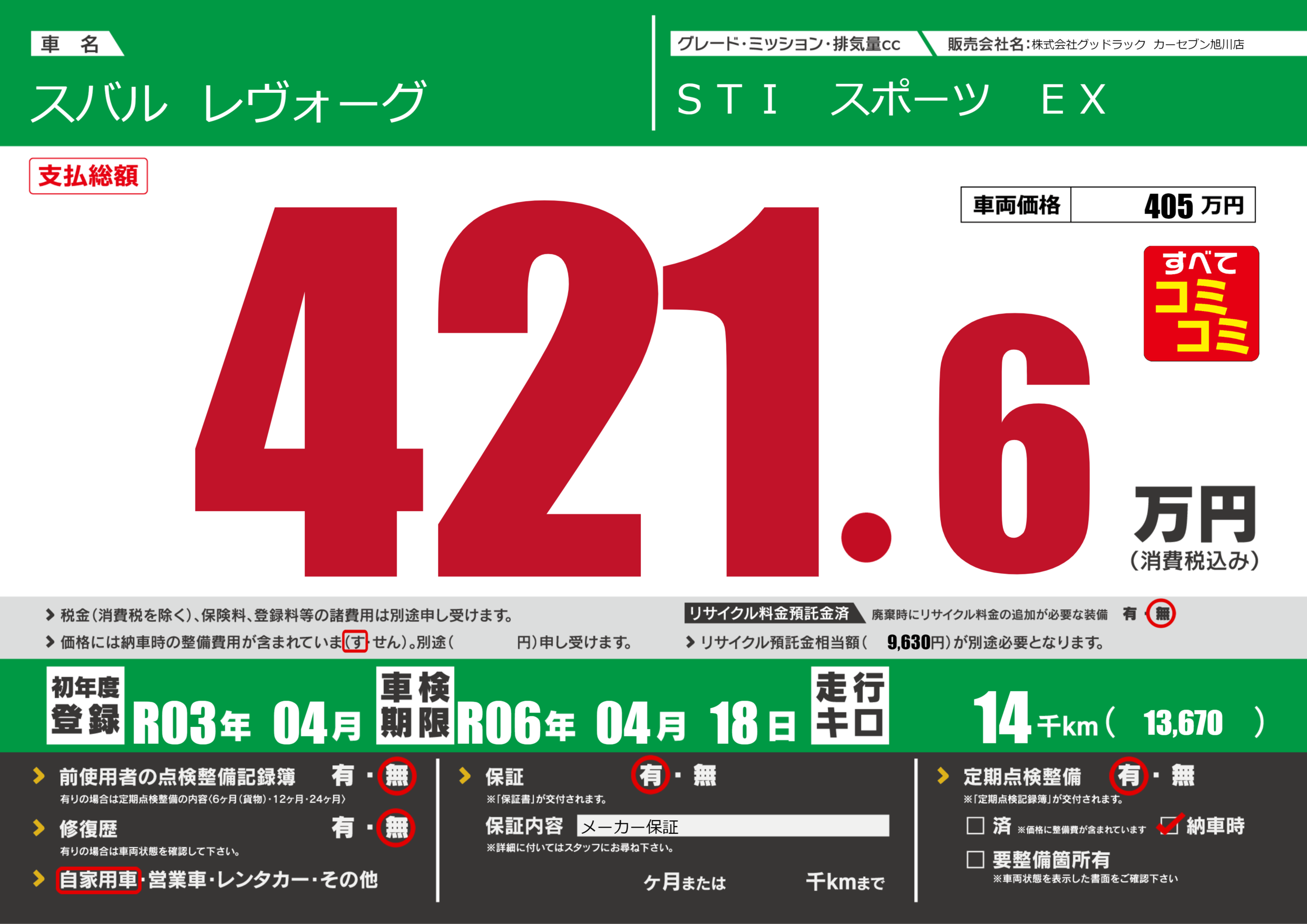 | 車名 | スバル レヴォーグ | グレード ミッション 排気量 |