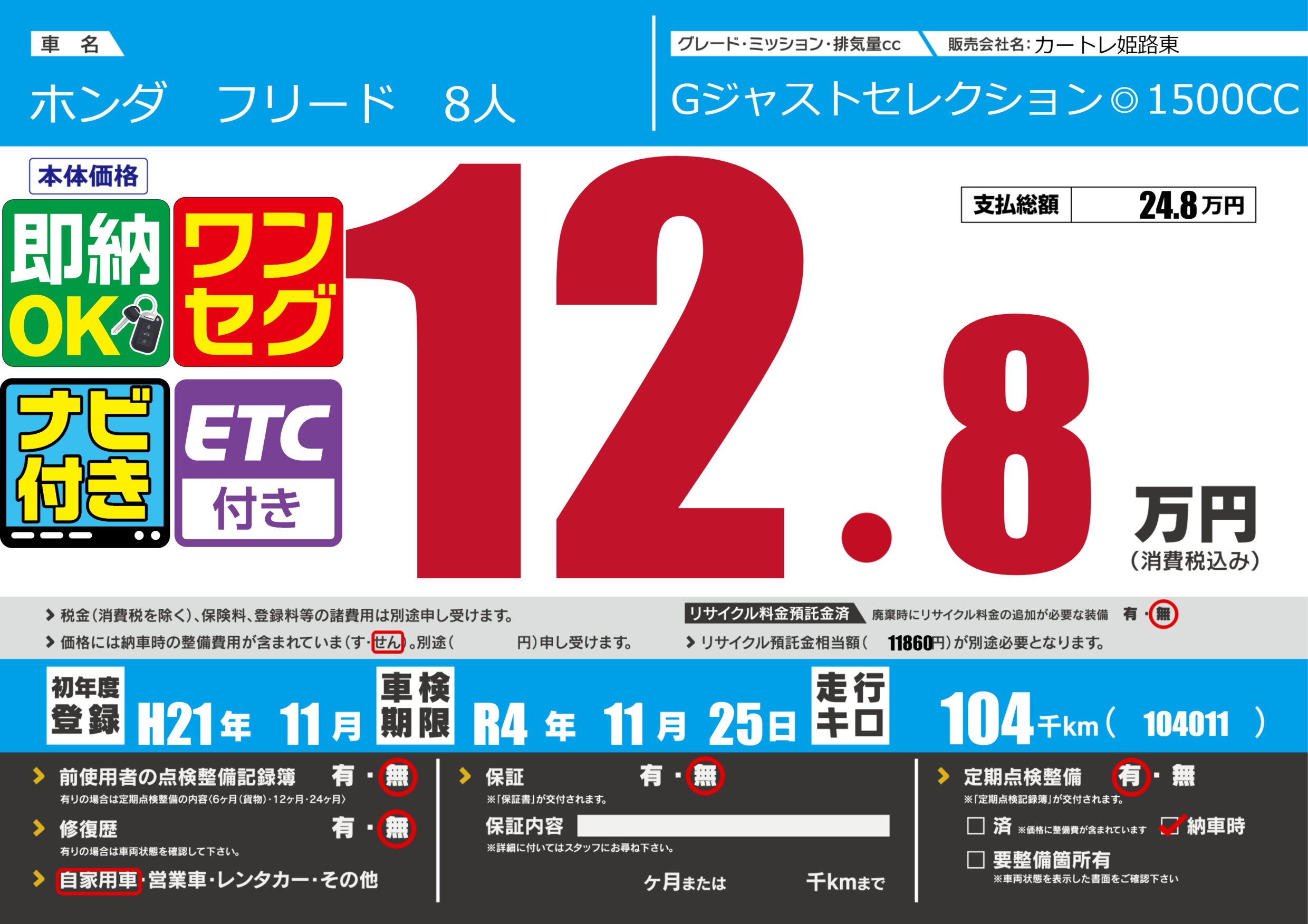 | 車名 | ホンダ フリード 8人 | グレード ミッション 排気量 |