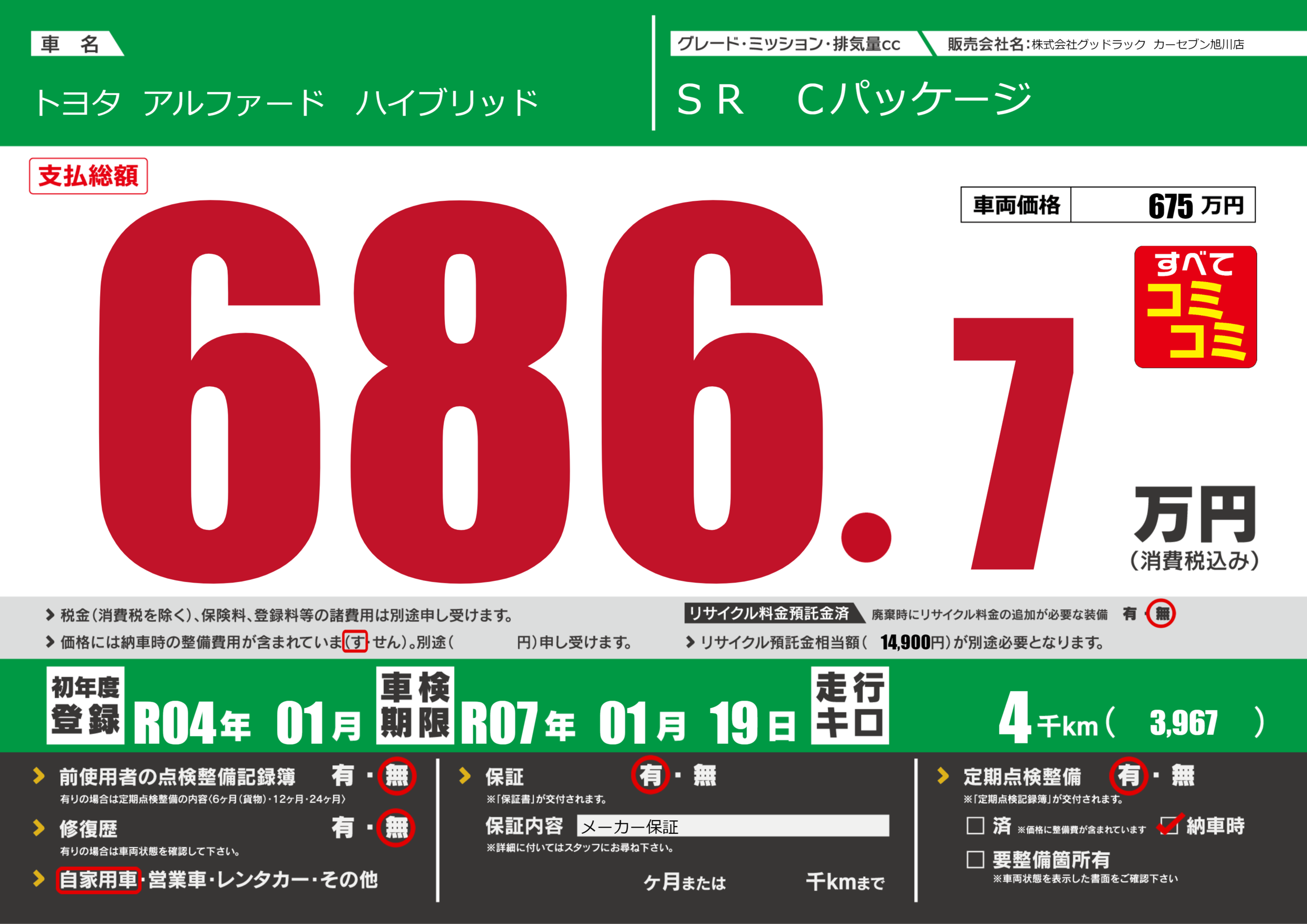 | 車名 | トヨタ アルファード ハイブリッド | グレード ミッション 排気量 |