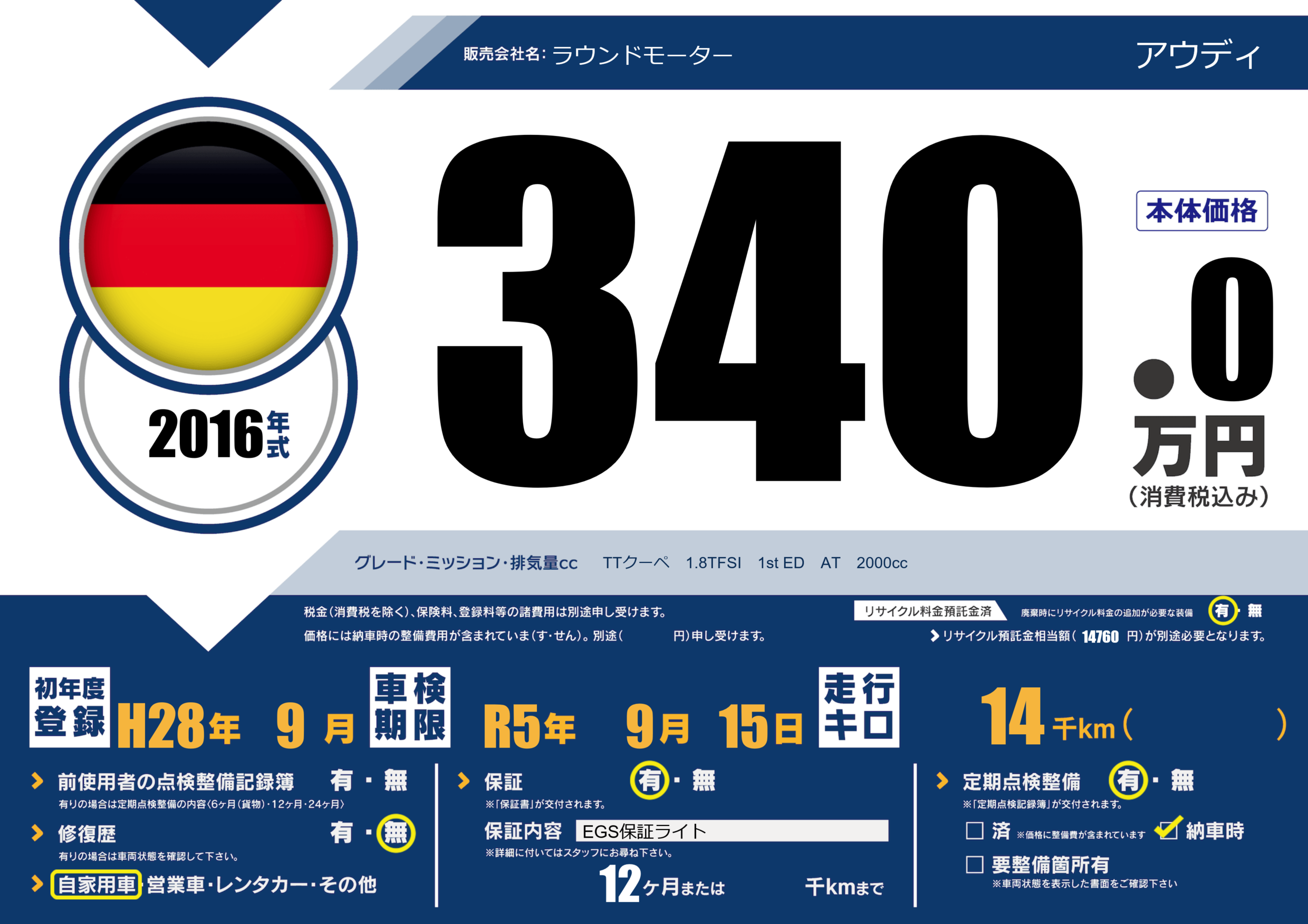 保証付き 保証内容(EGS保証ライト) 12ヶ月または()千kmまで |