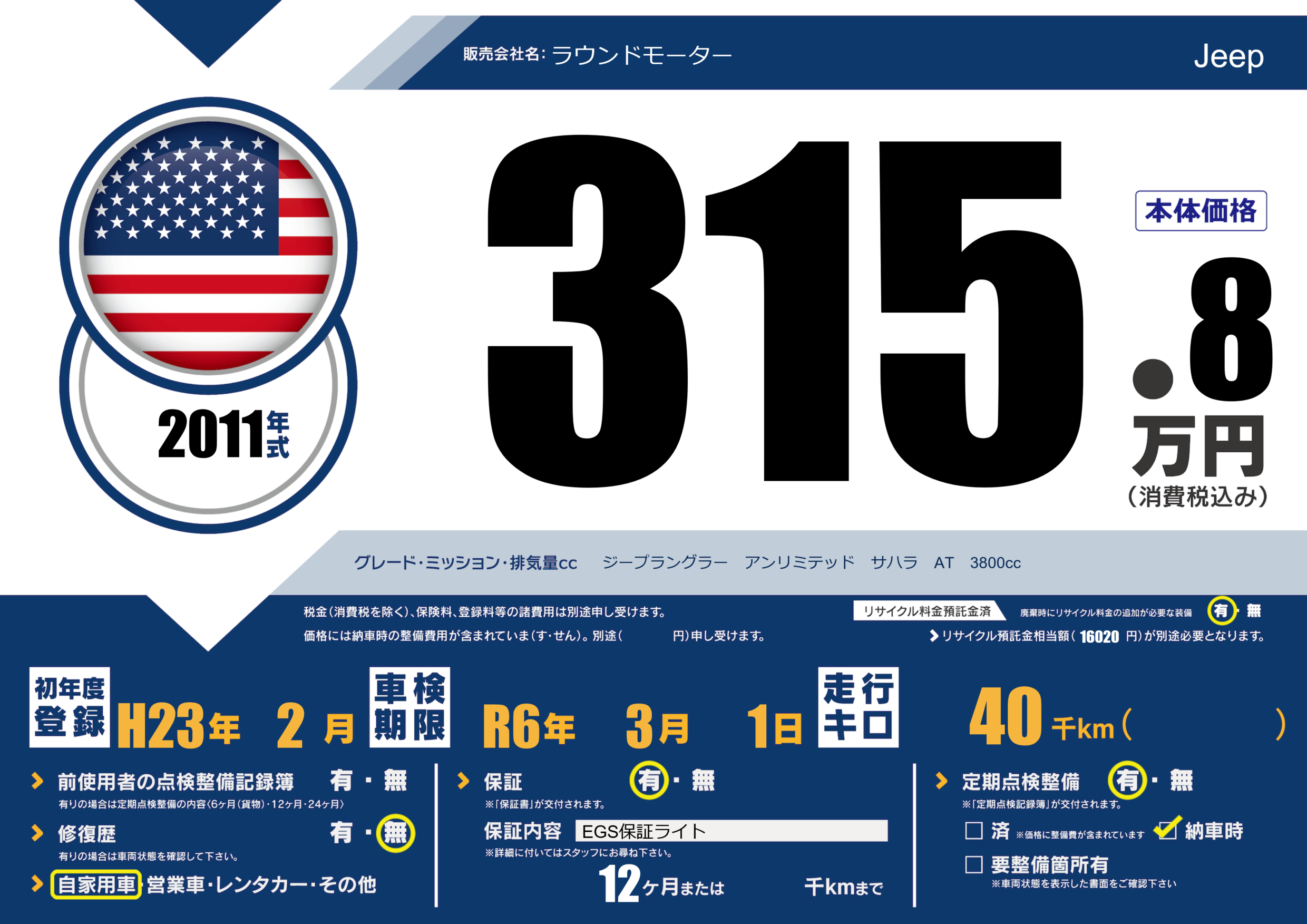 保証付き 保証内容(EGS保証ライト) 12ヶ月または()千kmまで |