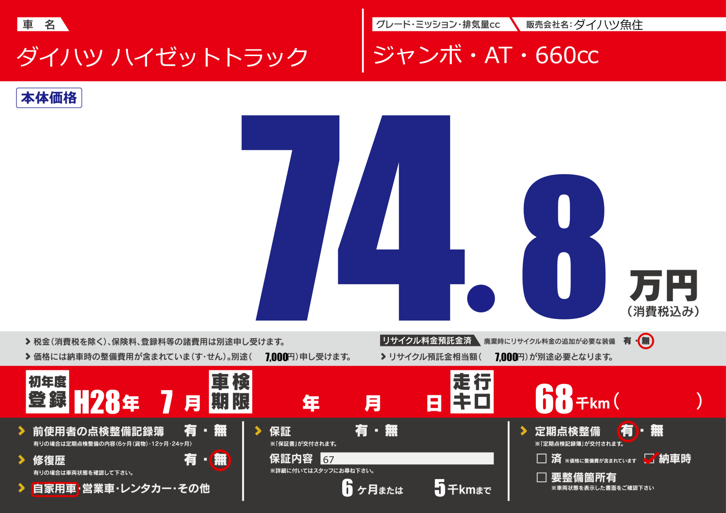 保証なし 保証内容(67) 6ヶ月または(5)千kmまで |