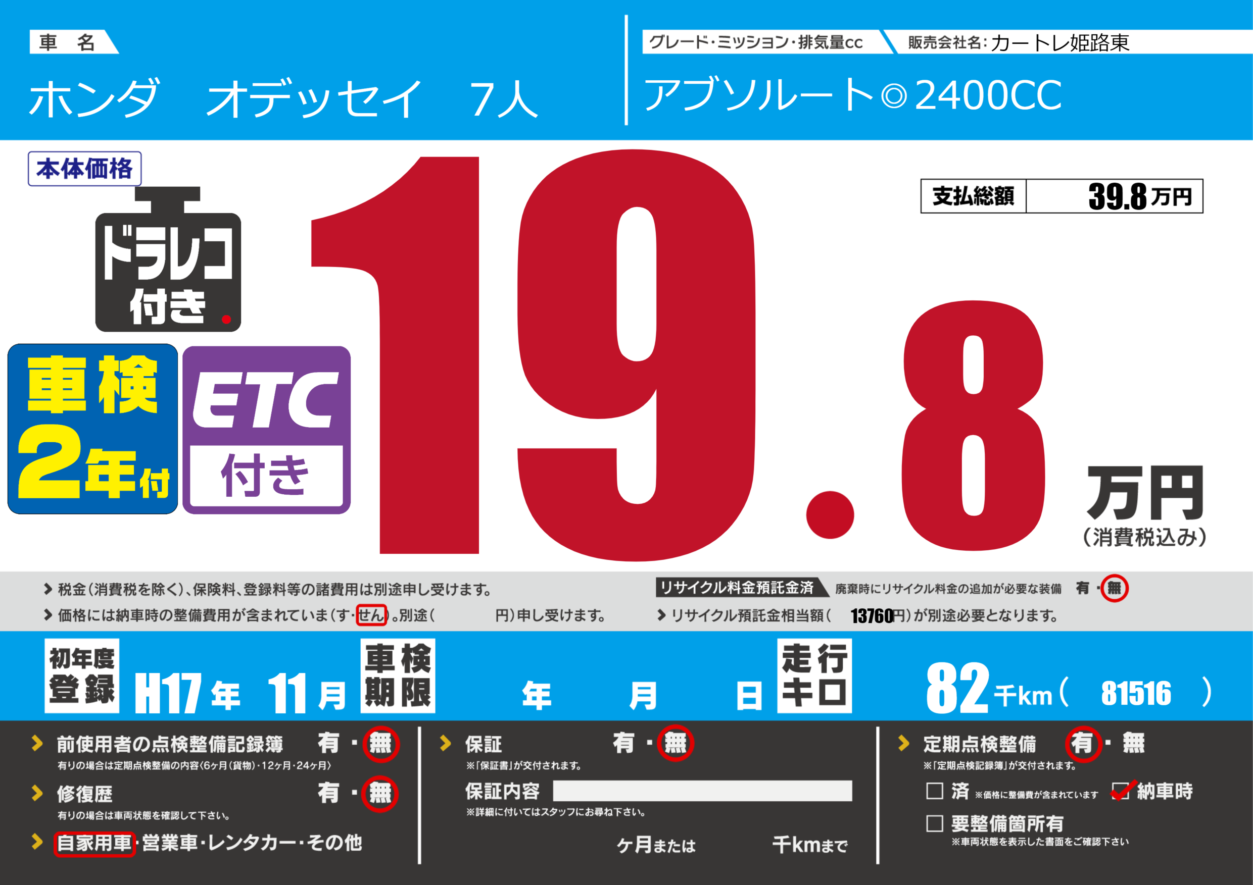 | 車名 | ホンダ オデッセイ 7人 | グレード ミッション 排気量 |