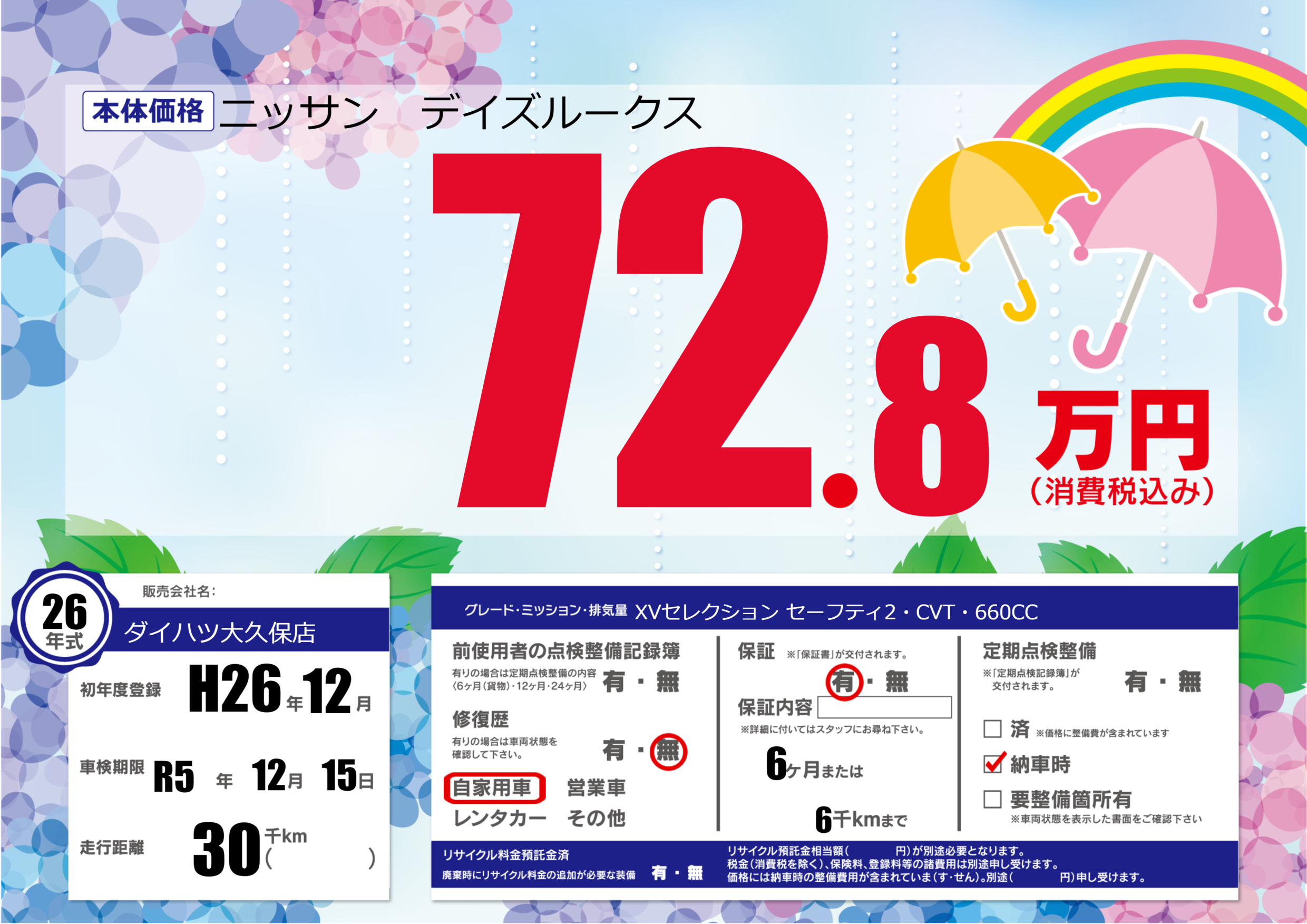 | 車名 | ニッサン デイズルークス | グレード ミッション 排気量 |
