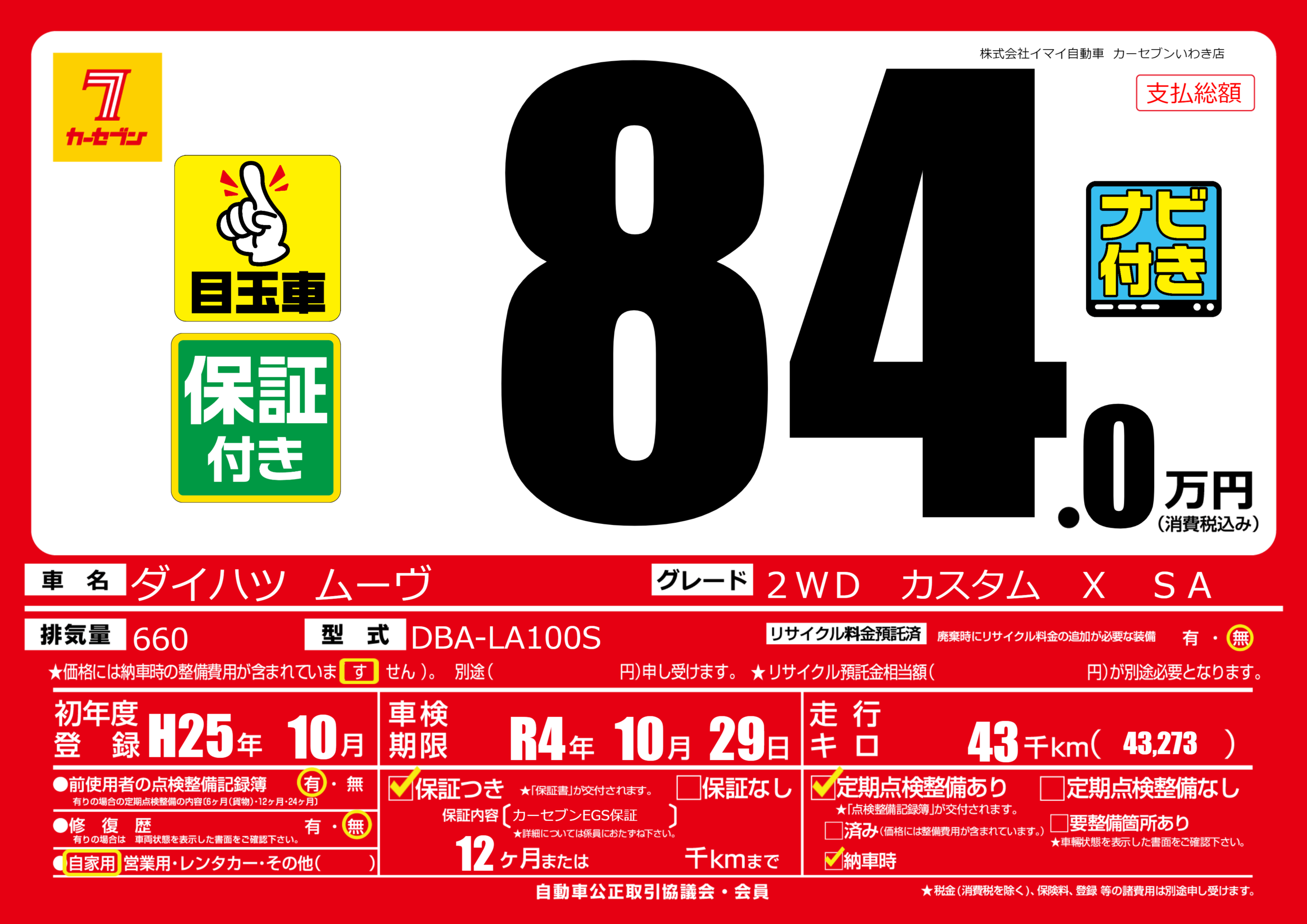 | 走行キロ | 4.3万km | 初年度登録 | H25年10月 |
