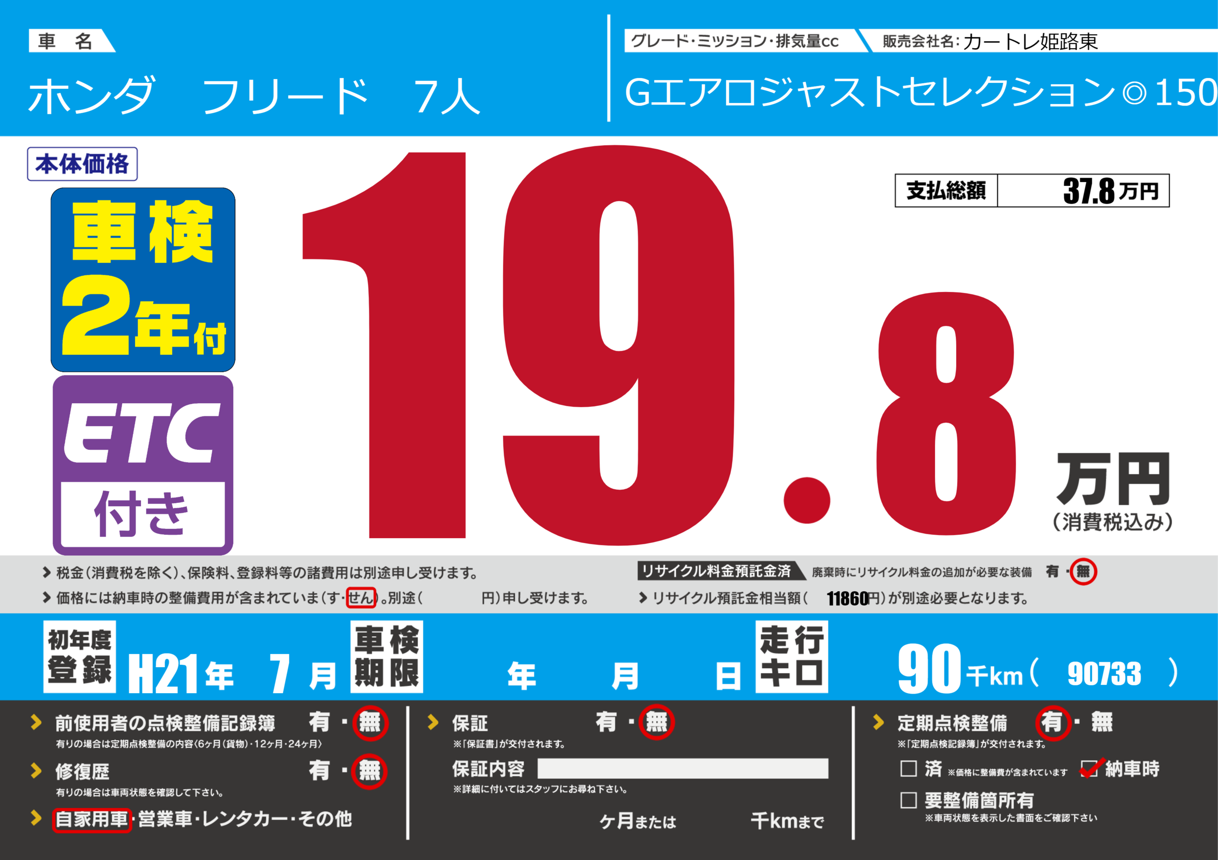 | 車名 | ホンダ フリード 7人 | グレード ミッション 排気量 |