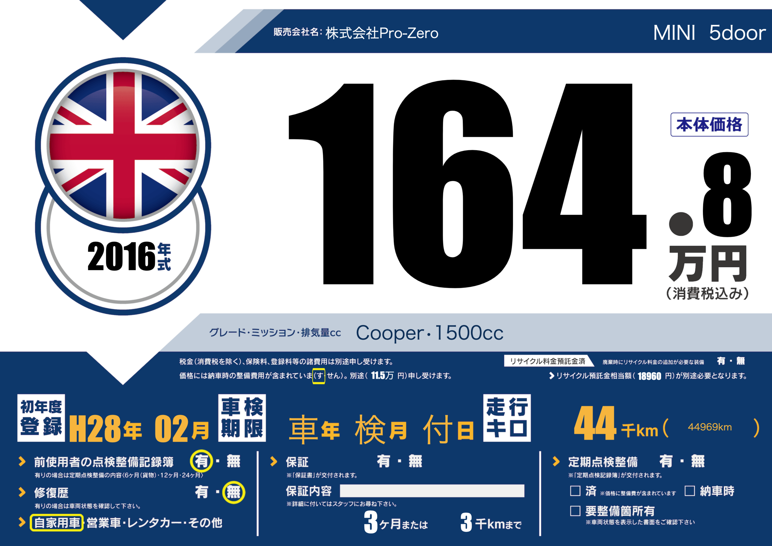 | 車名 | MINI 5door | グレード ミッション 排気量 |