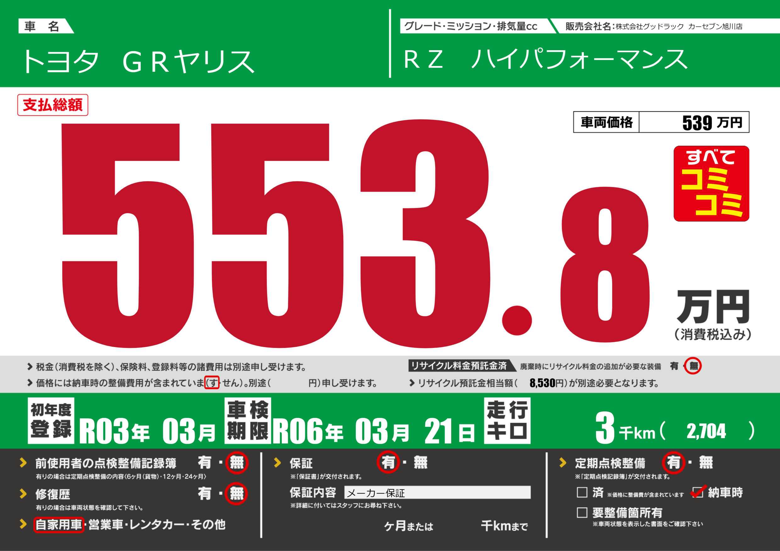 | 走行キロ | 0.3万km | 初年度登録 | R03年03月 |