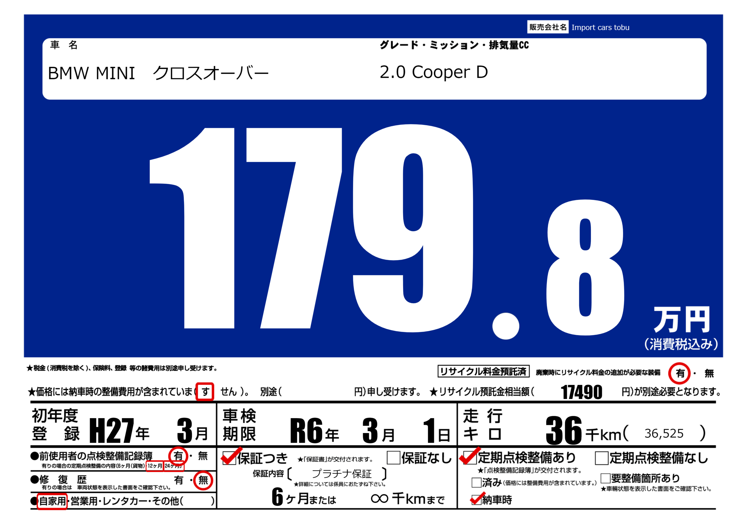 保証付き 保証内容( プラチナ保証) 6ヶ月または(∞)千kmまで |