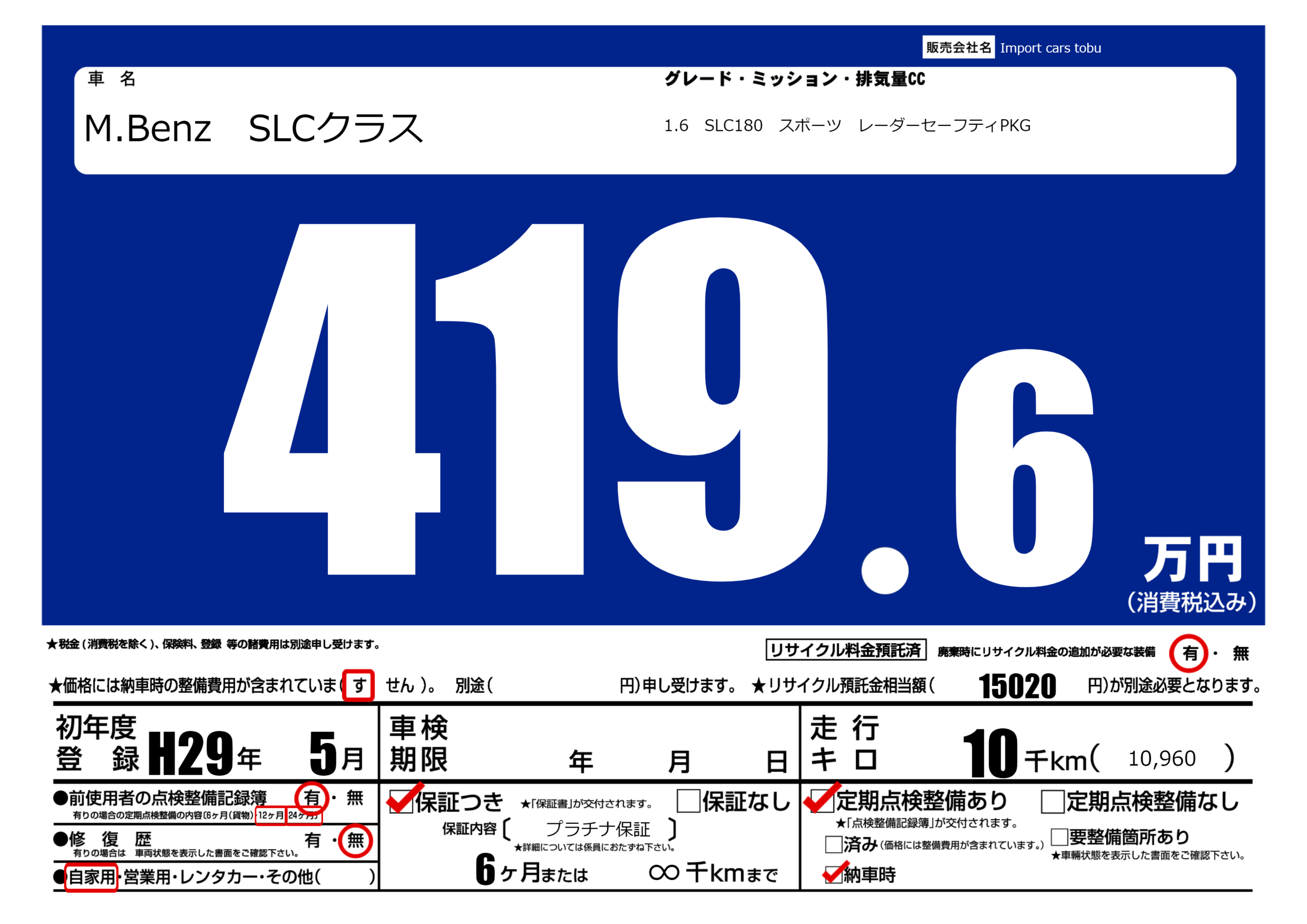 | 車名 | M.Benz SLCクラス | グレード ミッション 排気量 |