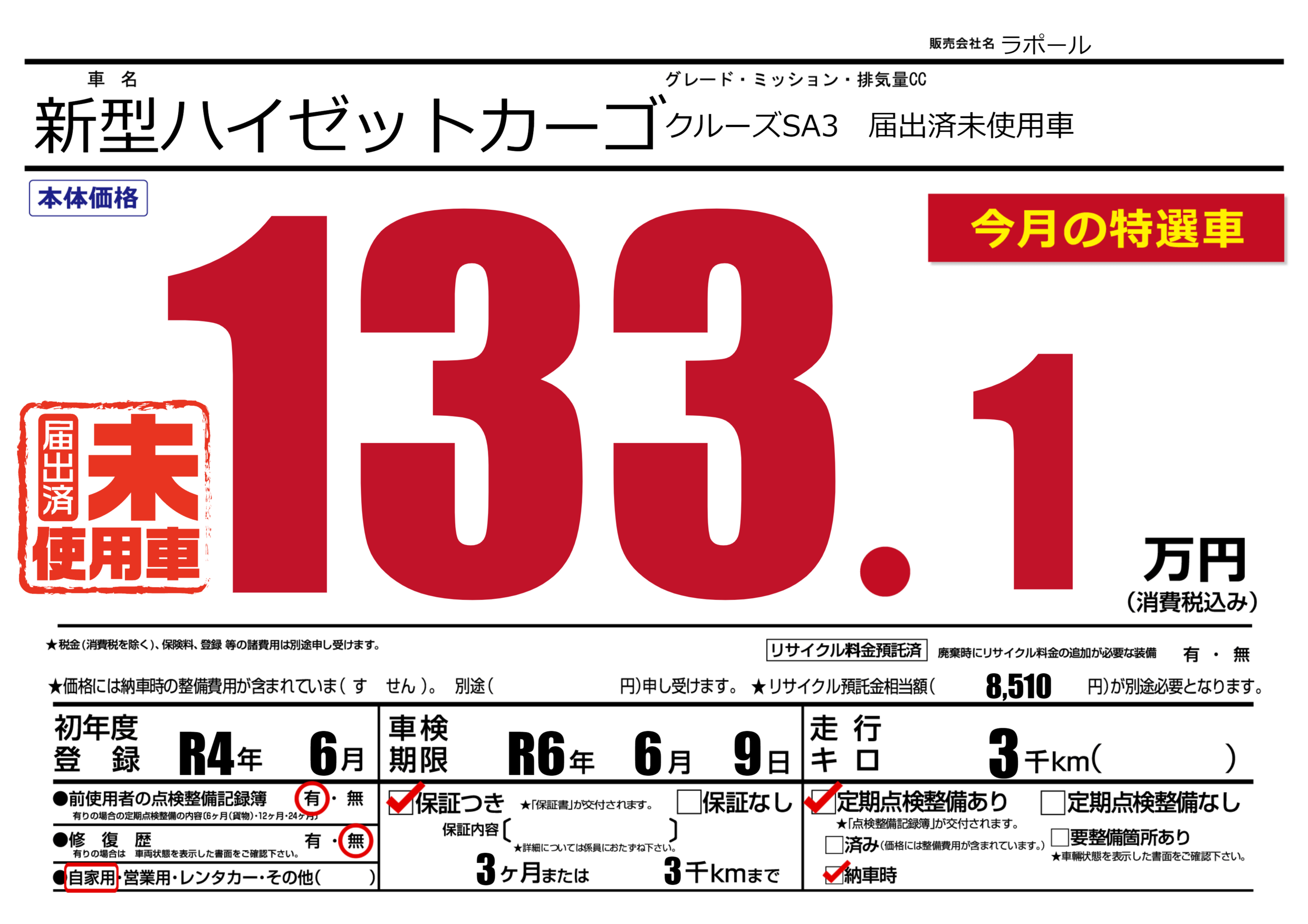保証付き 保証内容(---) 3ヶ月または(3)千kmまで |