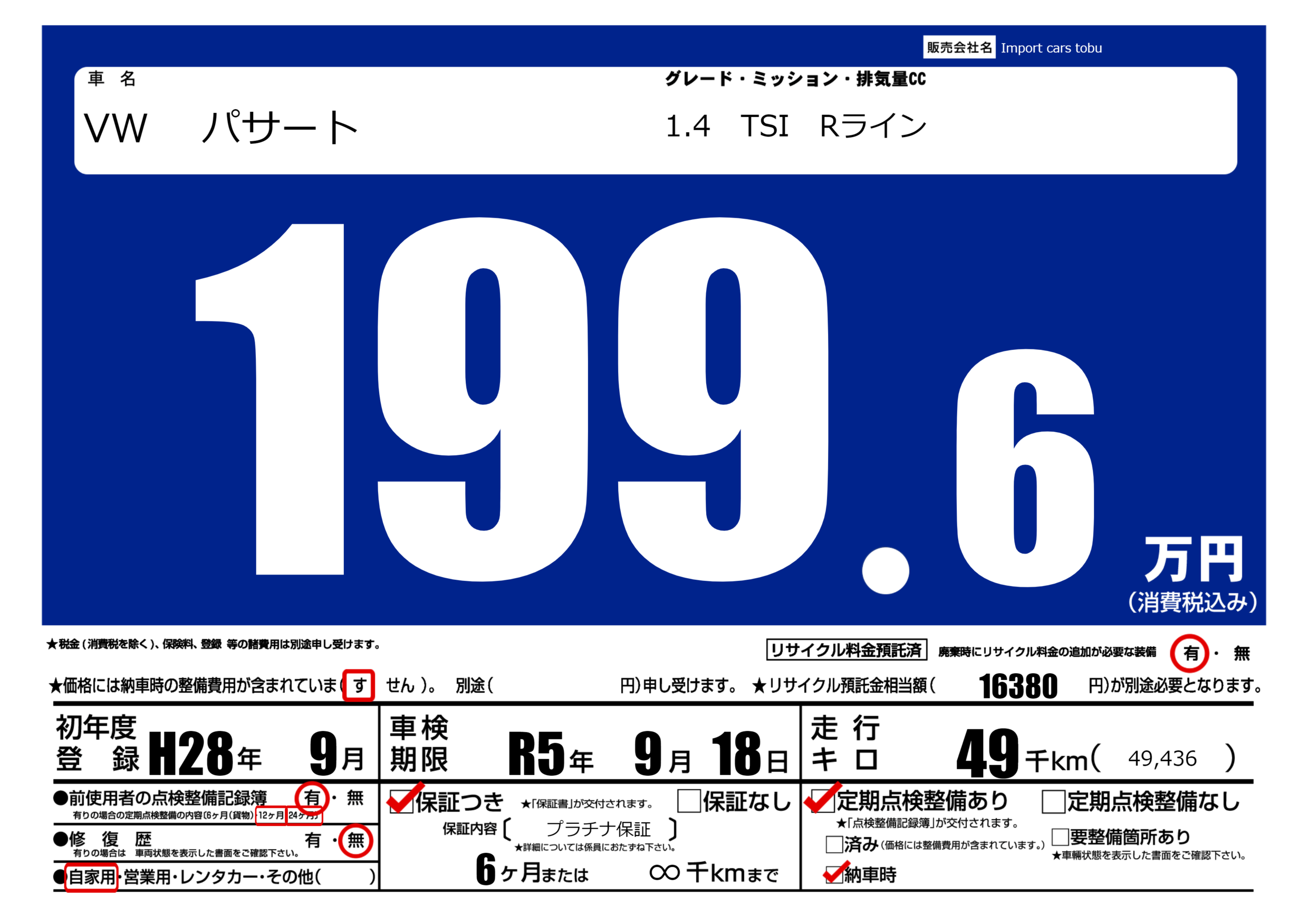 | 車名 | VW パサート | グレード ミッション 排気量 |