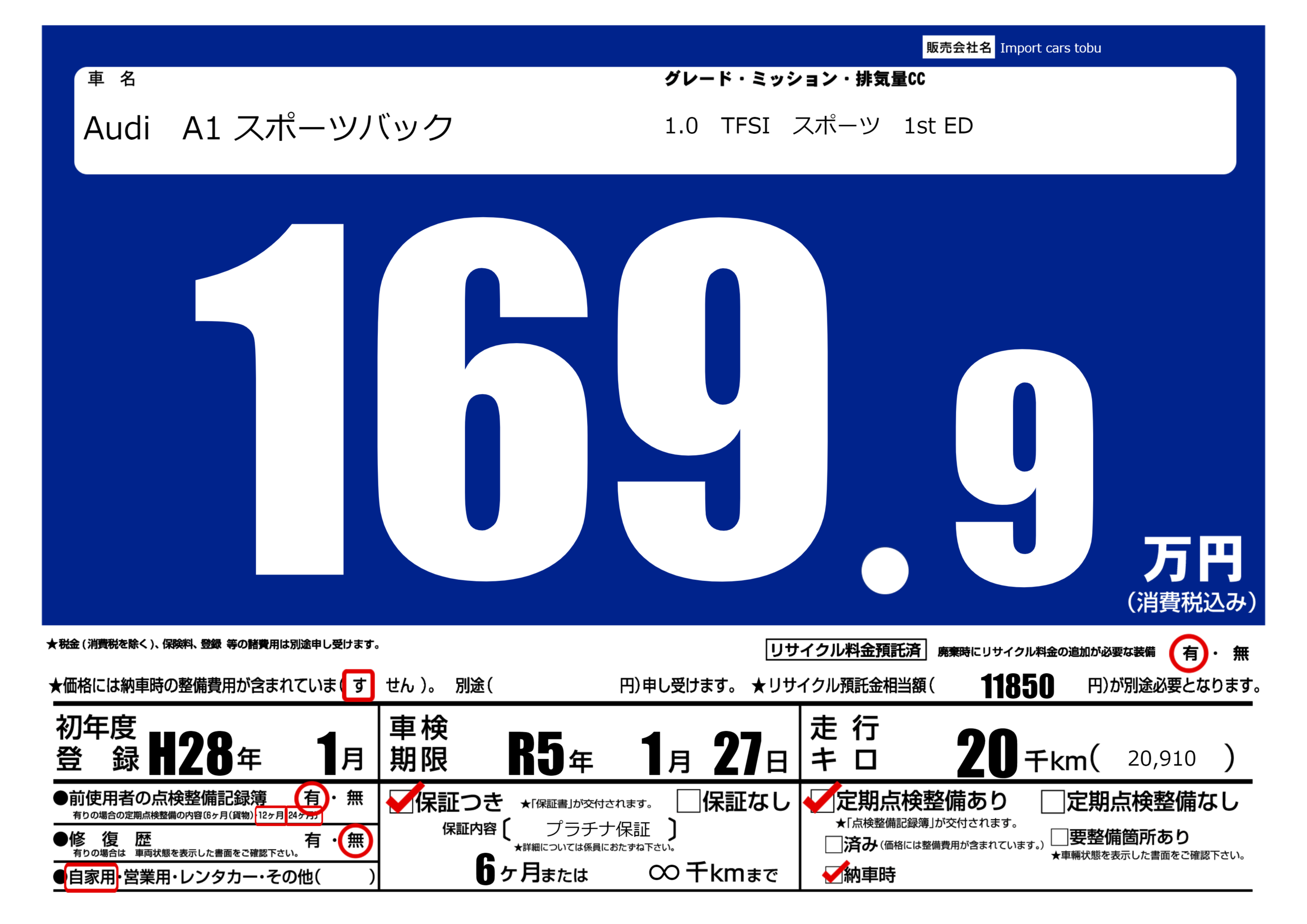 | 車名 | Audi A1 スポーツバック | グレード ミッション 排気量 |