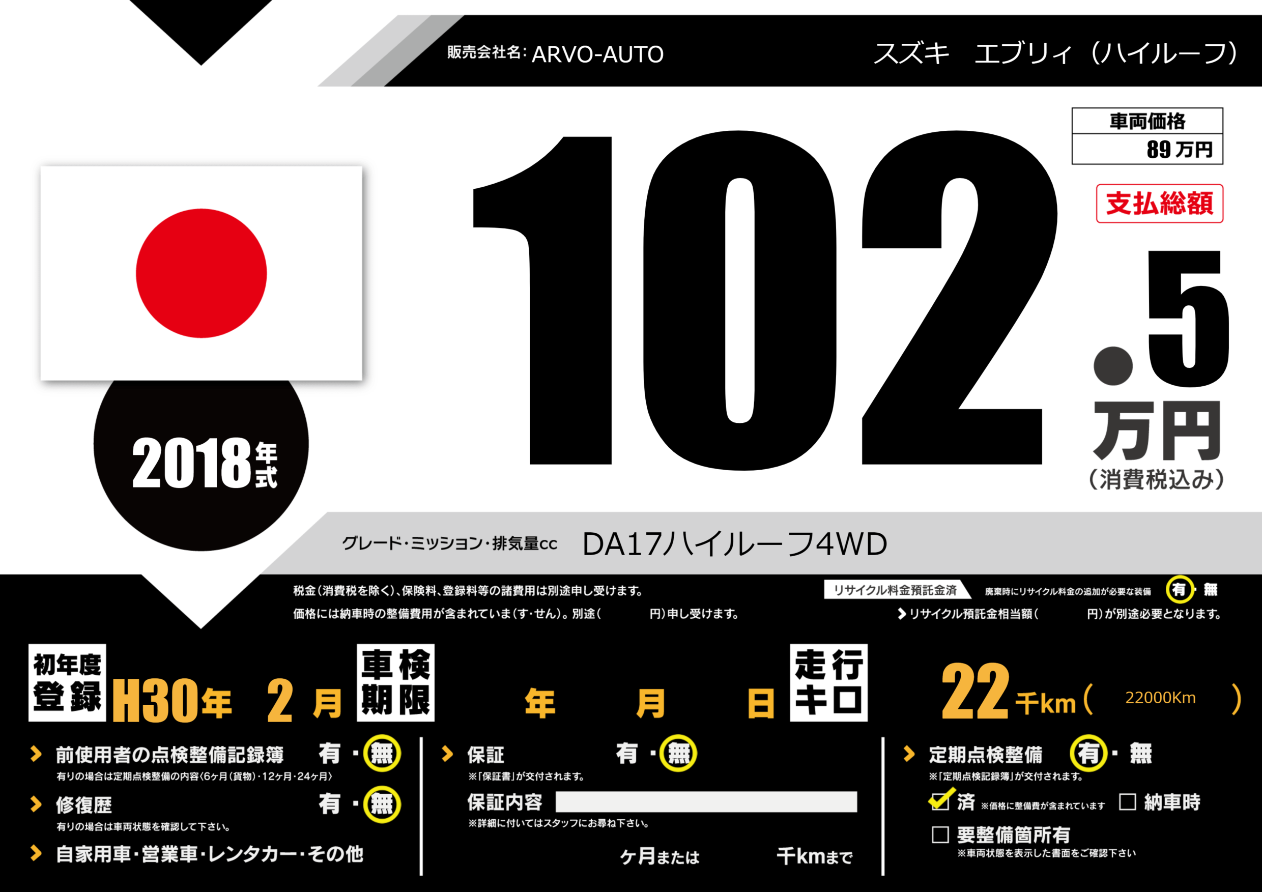 | 車名 | スズキ エブリィ(ハイルーフ) | グレード ミッション 排気量 |