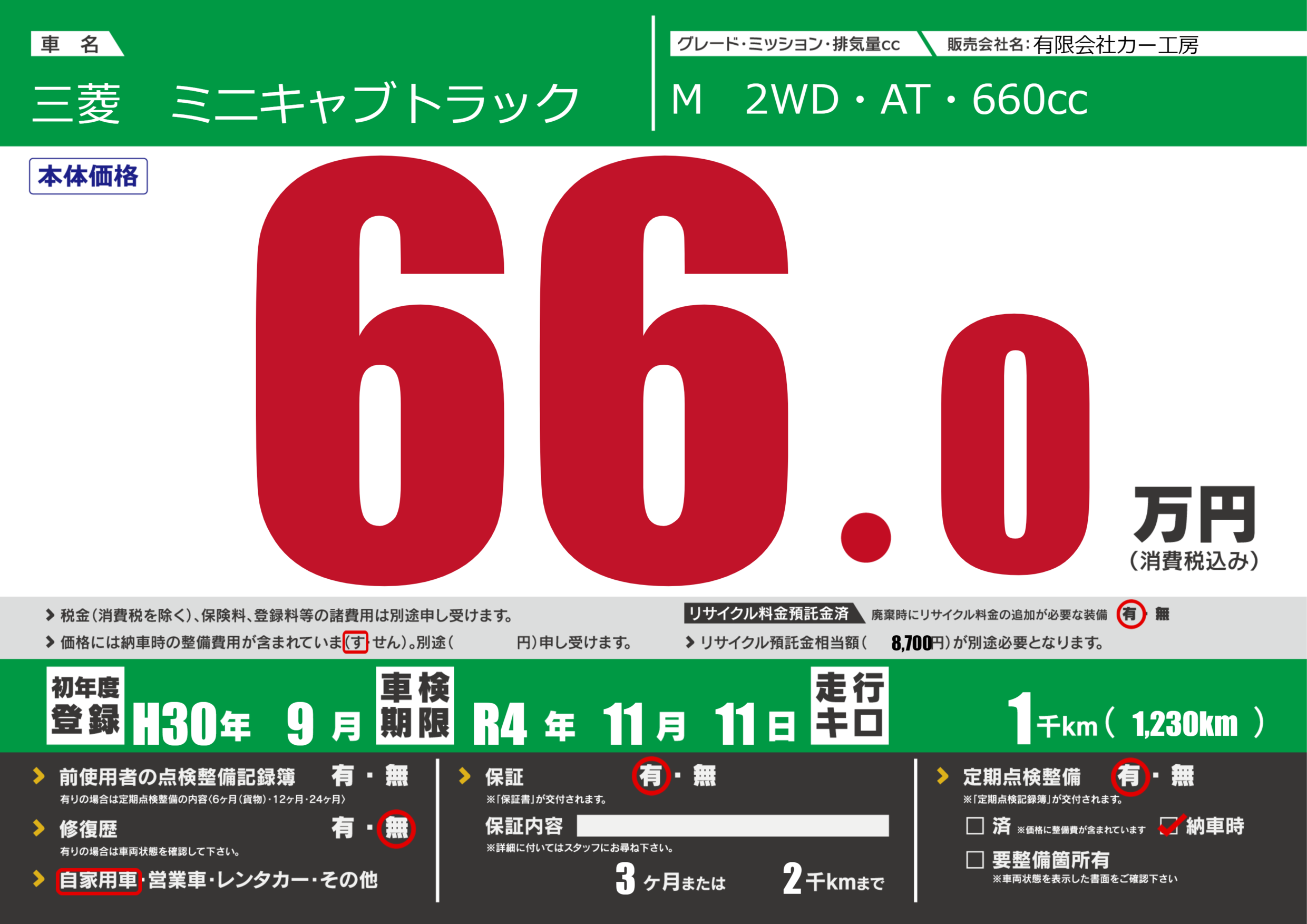 保証付き 保証内容(---) 3ヶ月または(2)千kmまで |