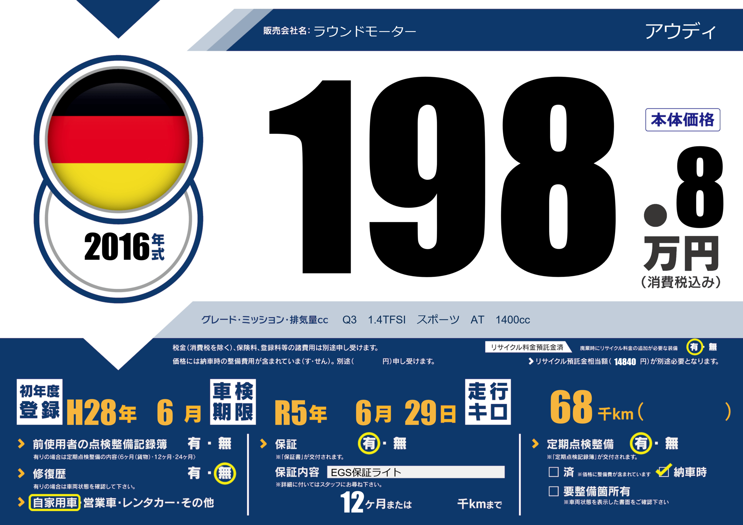 保証付き 保証内容(EGS保証ライト) 12ヶ月または()千kmまで |