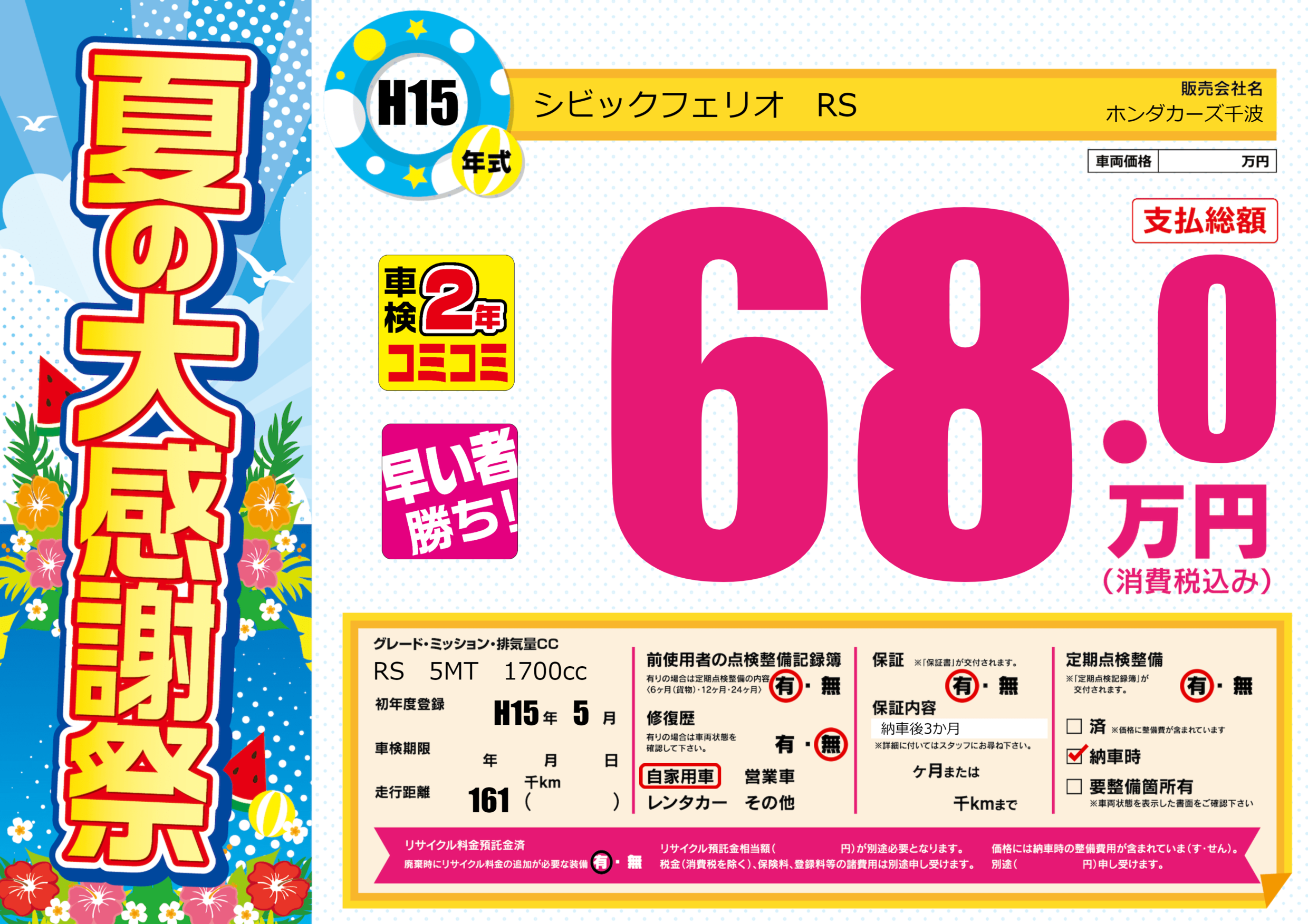 | 車名 | シビックフェリオ RS | グレード ミッション 排気量 |