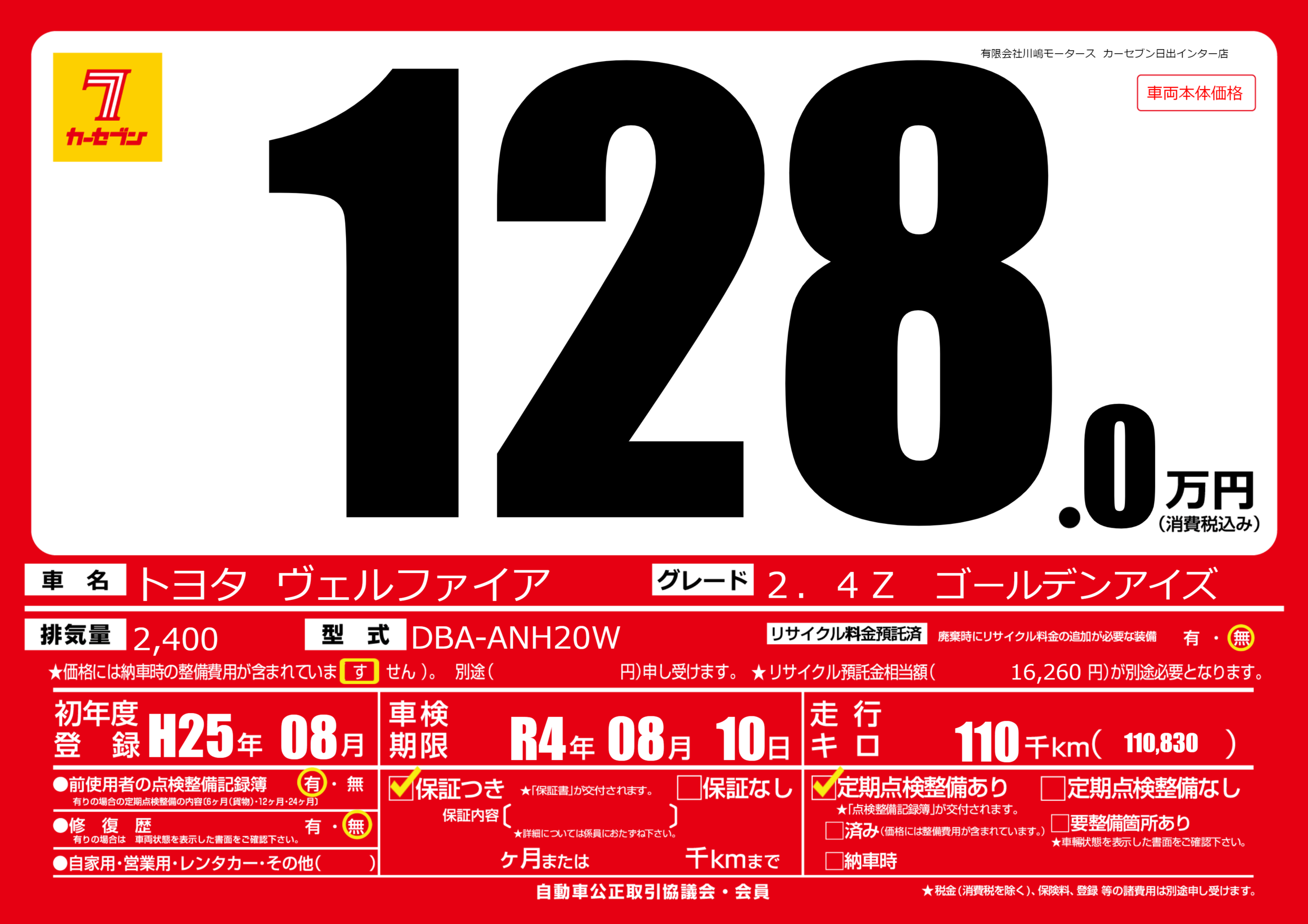 | 走行キロ | 11万km | 初年度登録 | H25年08月 |