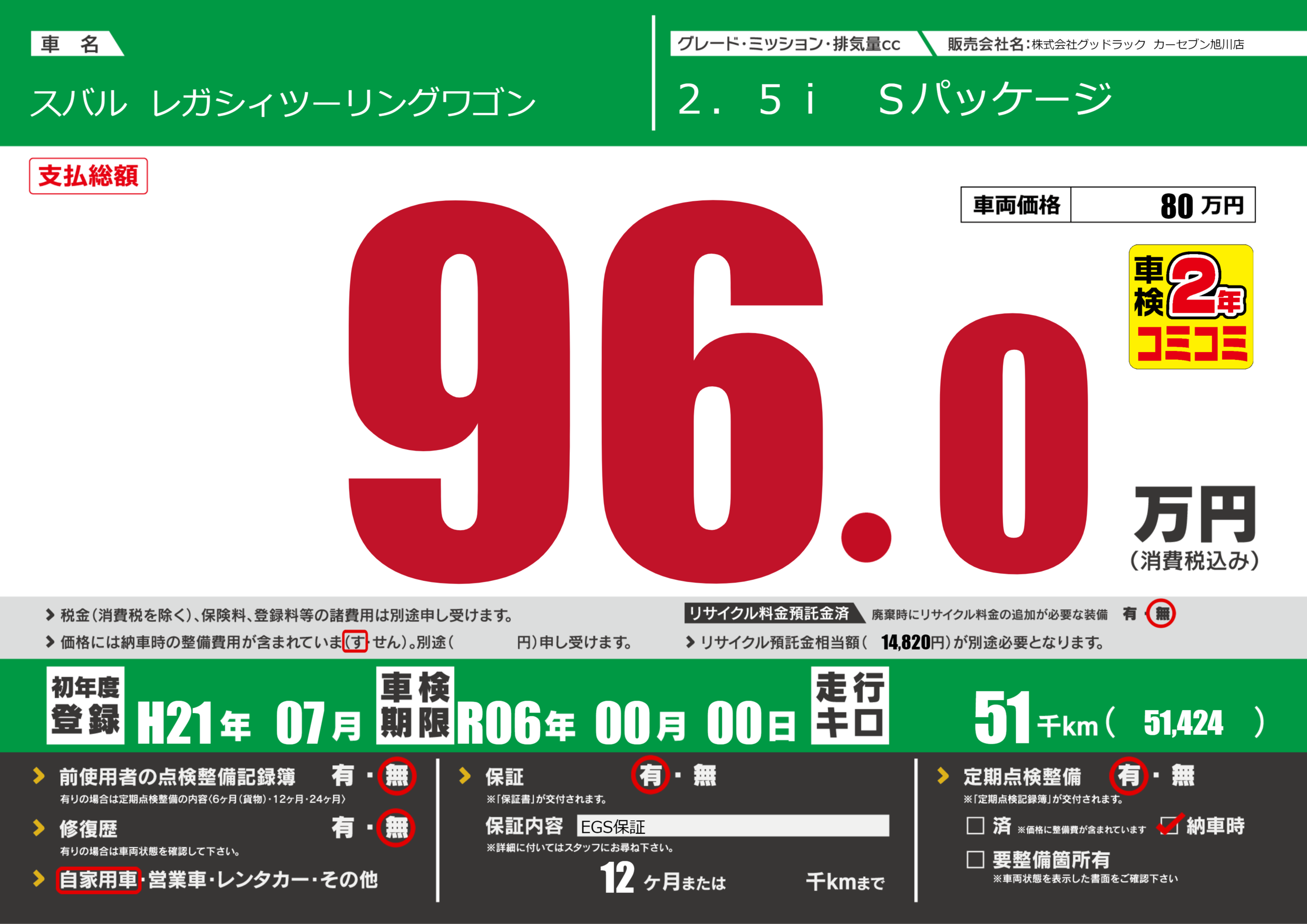 保証付き 保証内容(EGS保証) 12ヶ月または千km |